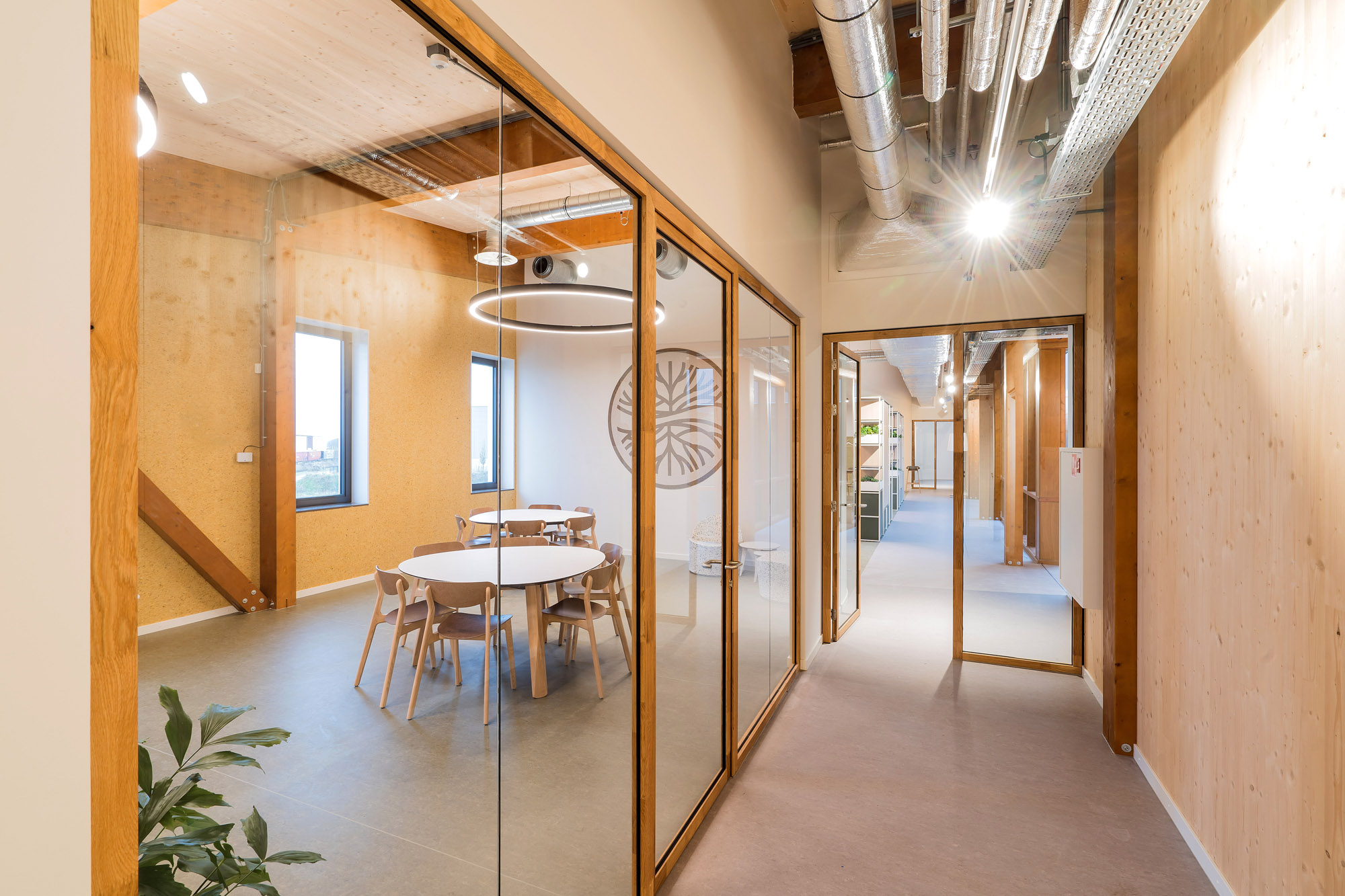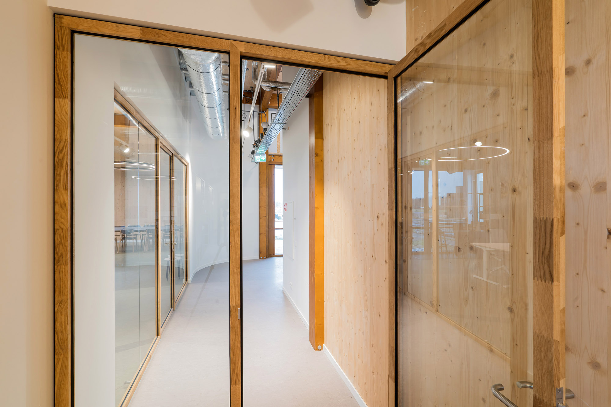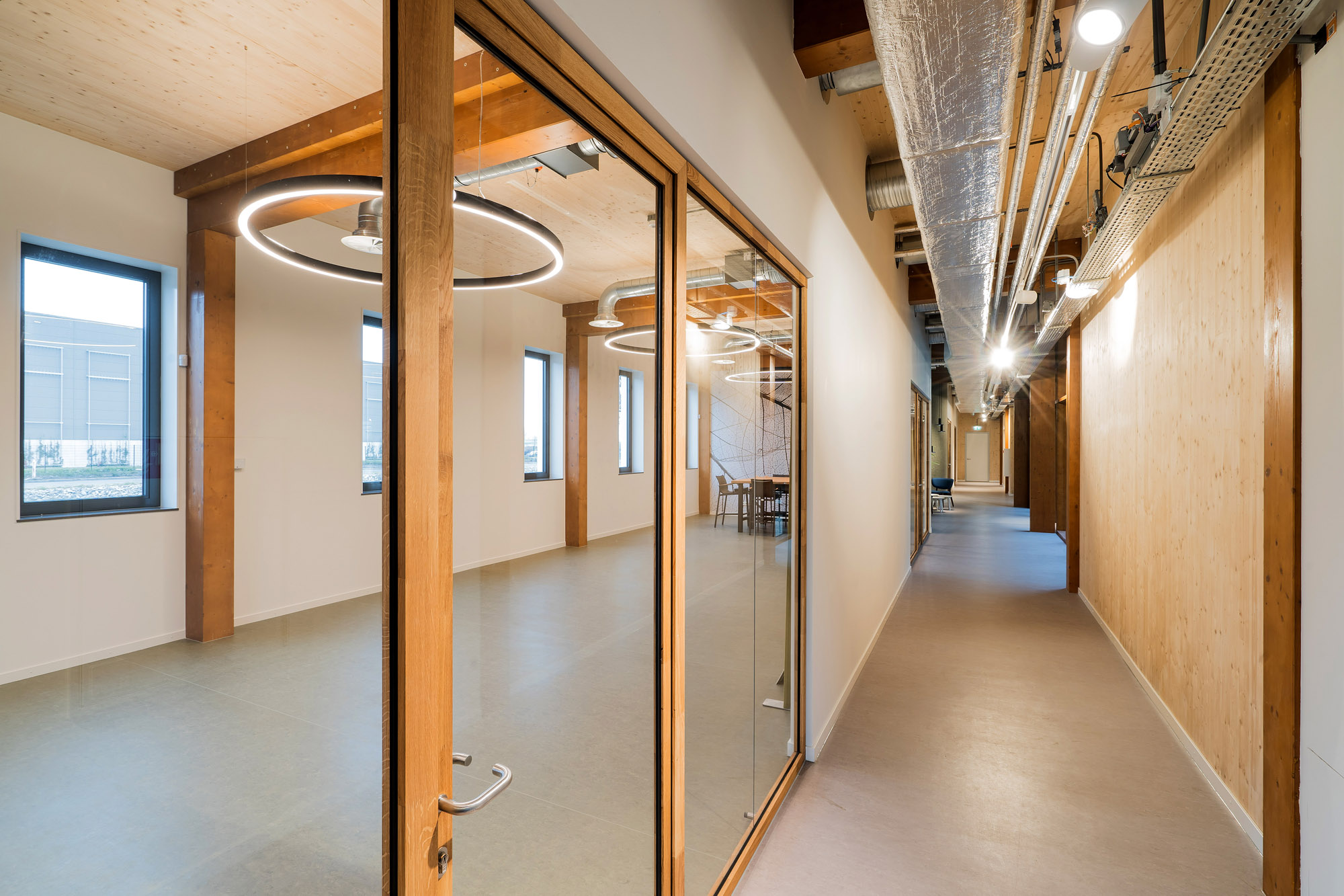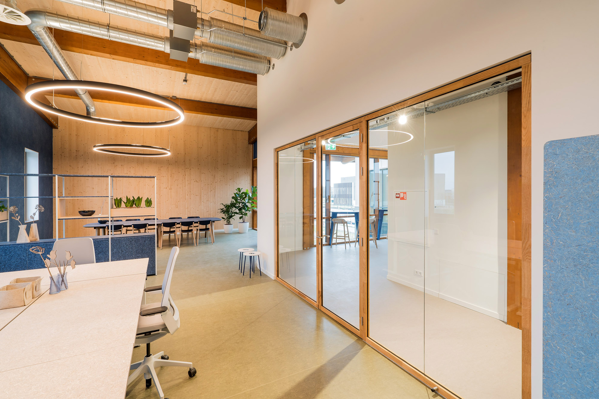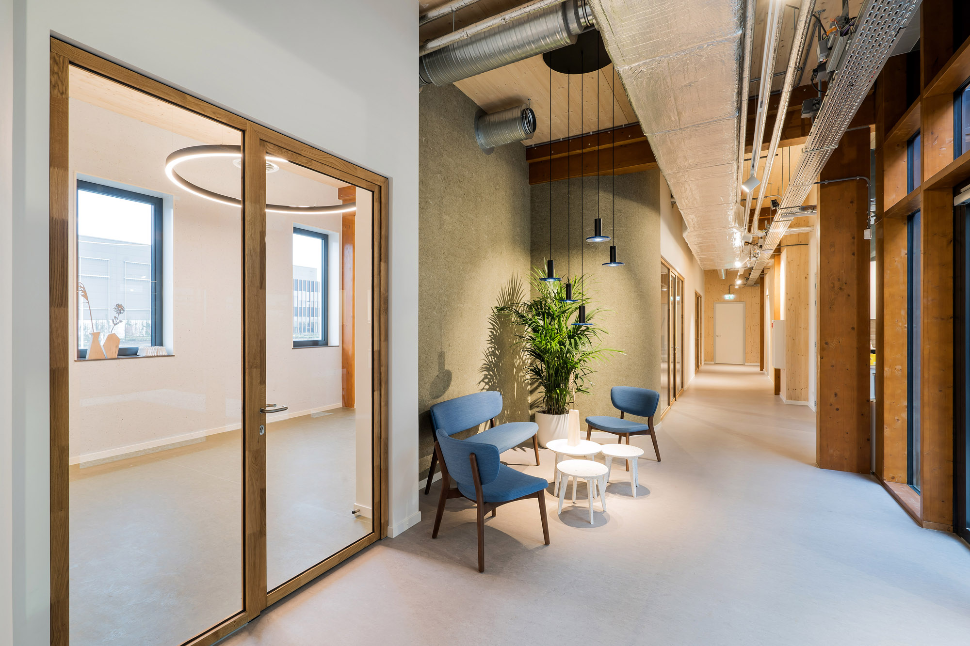 Vanuit Intermontage mochten wij bijdragen aan dit project met de inzet van onze WoodFrame Slim systeemwanden. Deze duurzame oplossing, opgebouwd uit slanke houten profielen van massief Europees eiken uit reststromen van de meubelindustrie, sluit naadloos aan bij het circulaire karakter van Rootz. Door de combinatie van glas en hout ontstaat er transparantie en warmte. Datgene wat een kenniscentrum als dit nodig heeft: helder zicht op samenwerking, zonder in te leveren op akoestisch comfort en uitstraling.