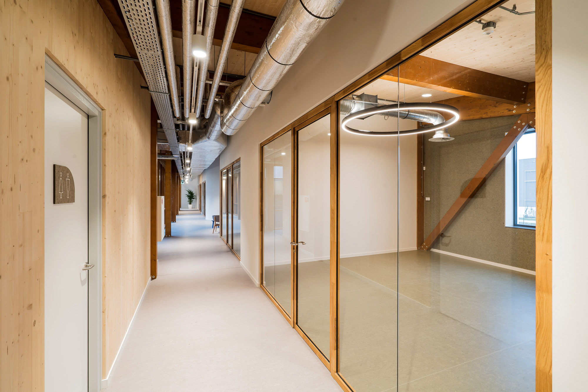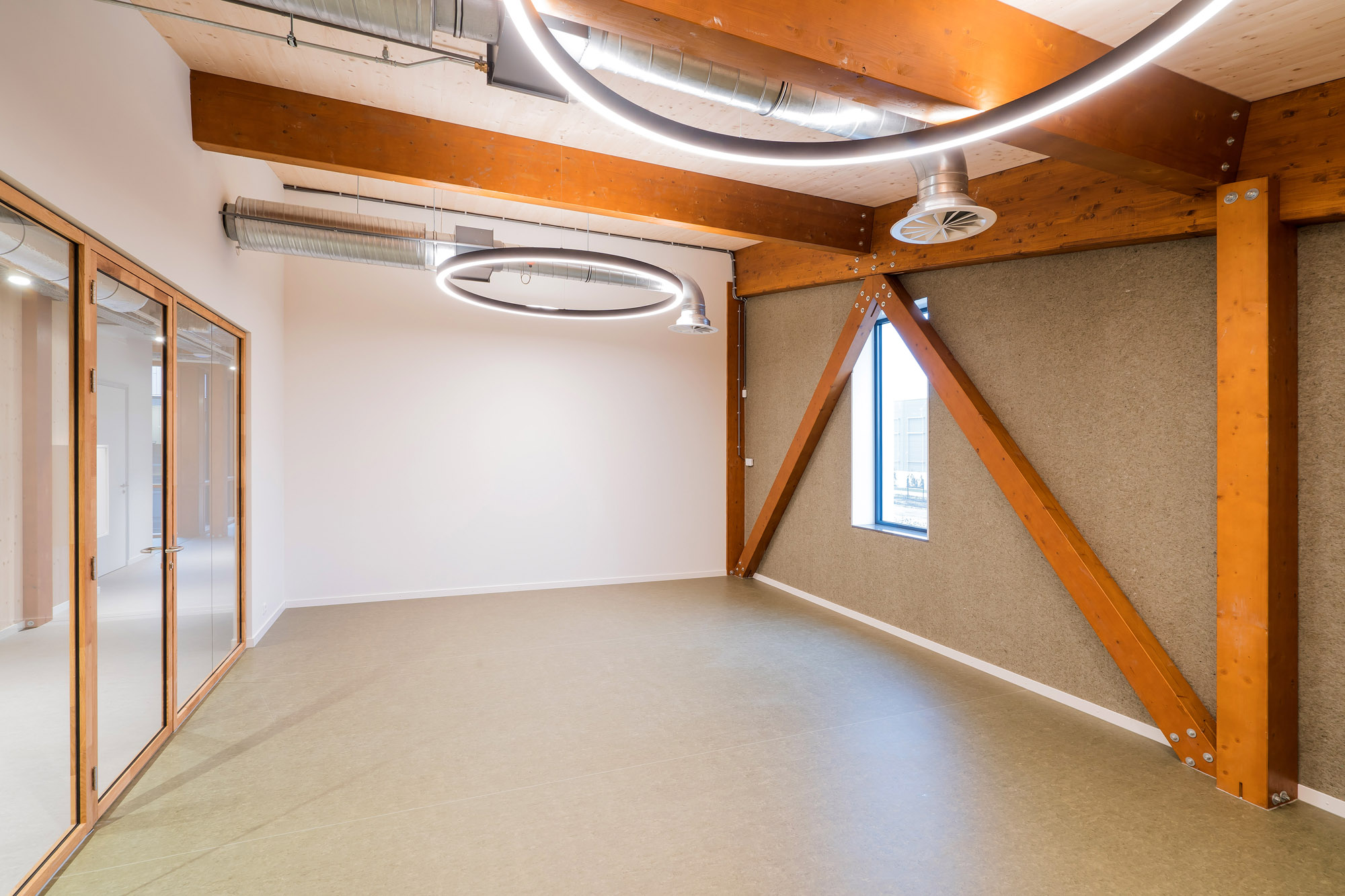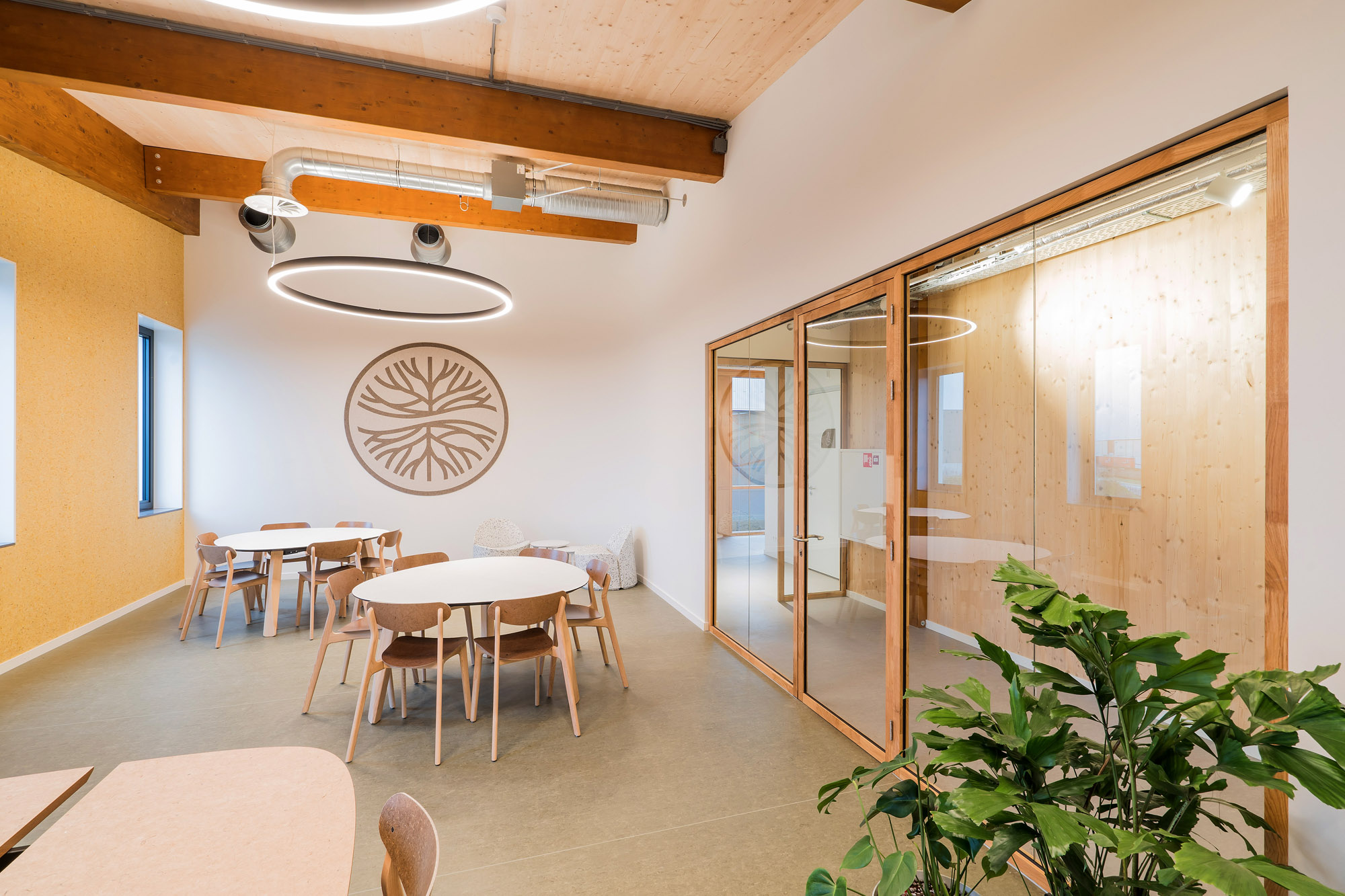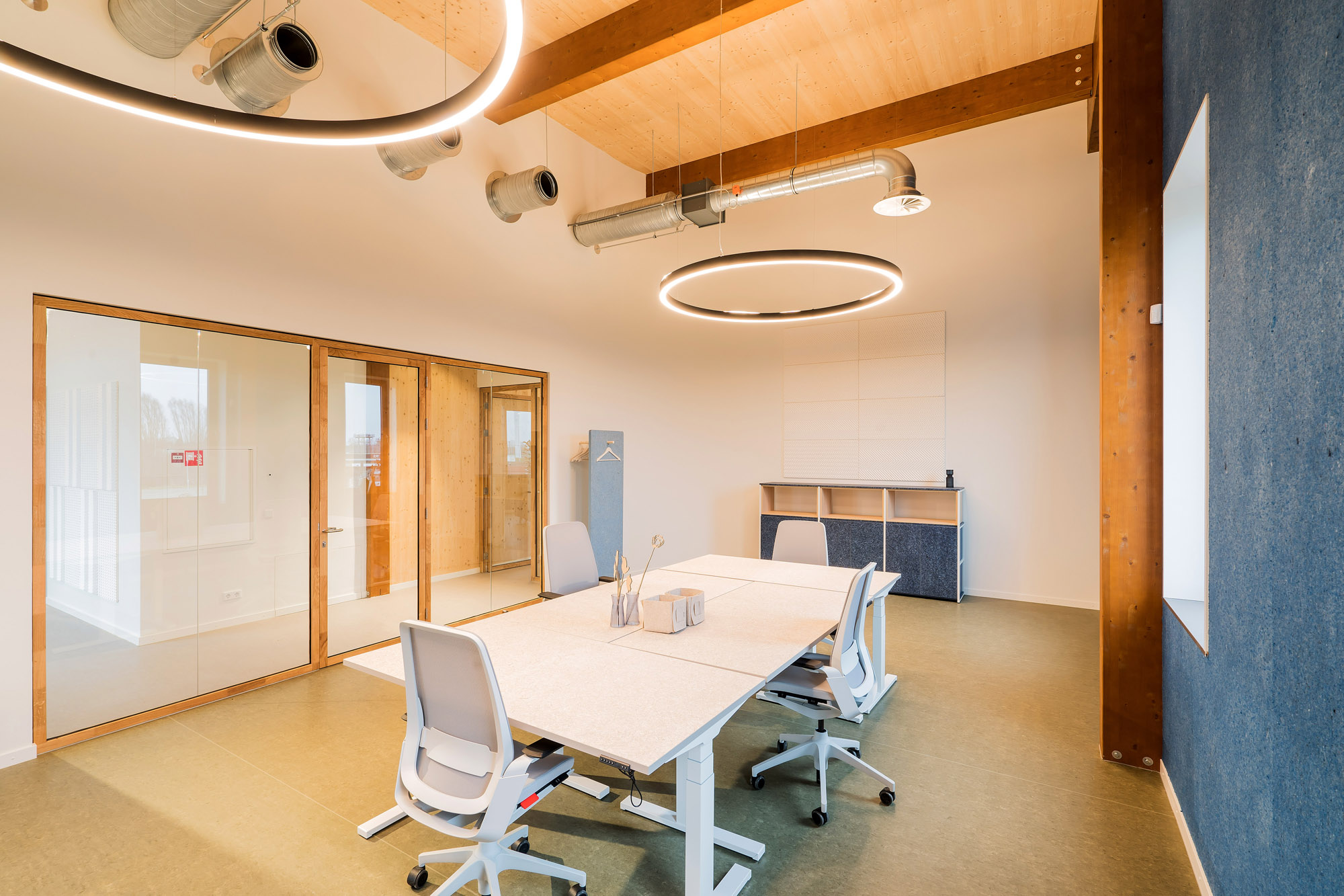 Vanuit Intermontage mochten wij bijdragen aan dit project met de inzet van onze WoodFrame Slim systeemwanden. Deze duurzame oplossing, opgebouwd uit slanke houten profielen van massief Europees eiken uit reststromen van de meubelindustrie, sluit naadloos aan bij het circulaire karakter van Rootz. Door de combinatie van glas en hout ontstaat er transparantie en warmte. Datgene wat een kenniscentrum als dit nodig heeft: helder zicht op samenwerking, zonder in te leveren op akoestisch comfort en uitstraling.