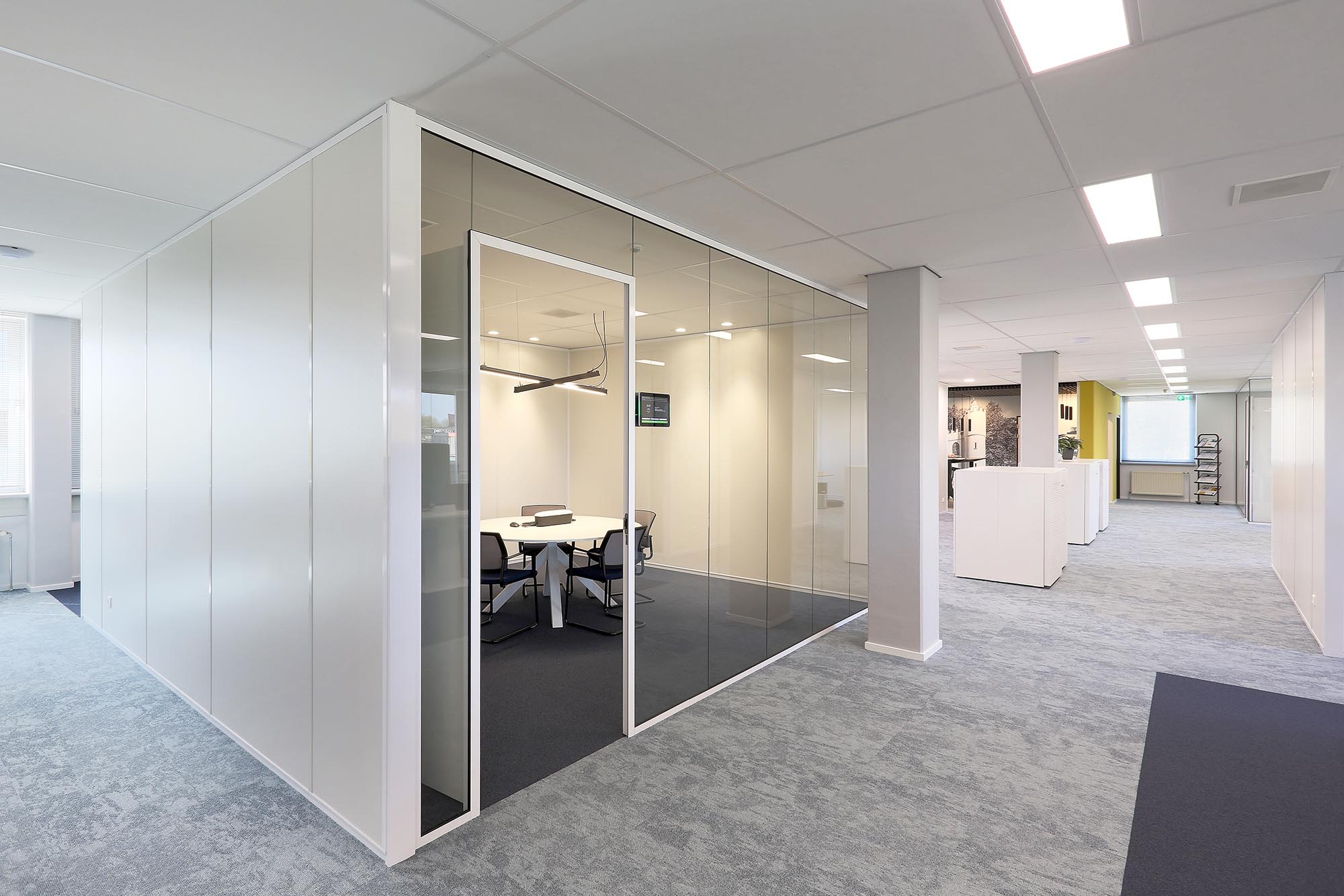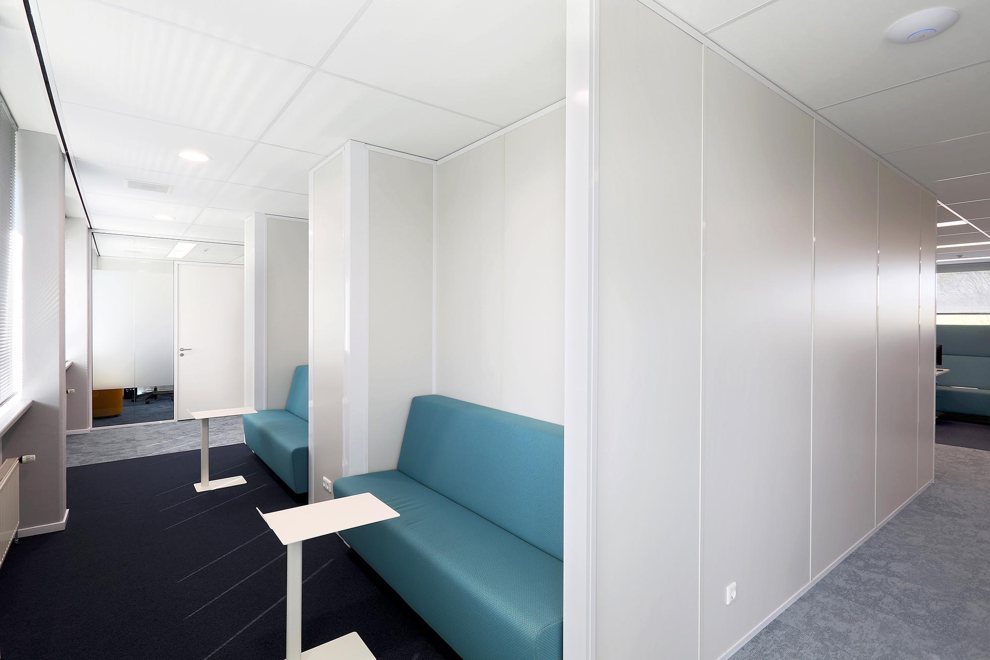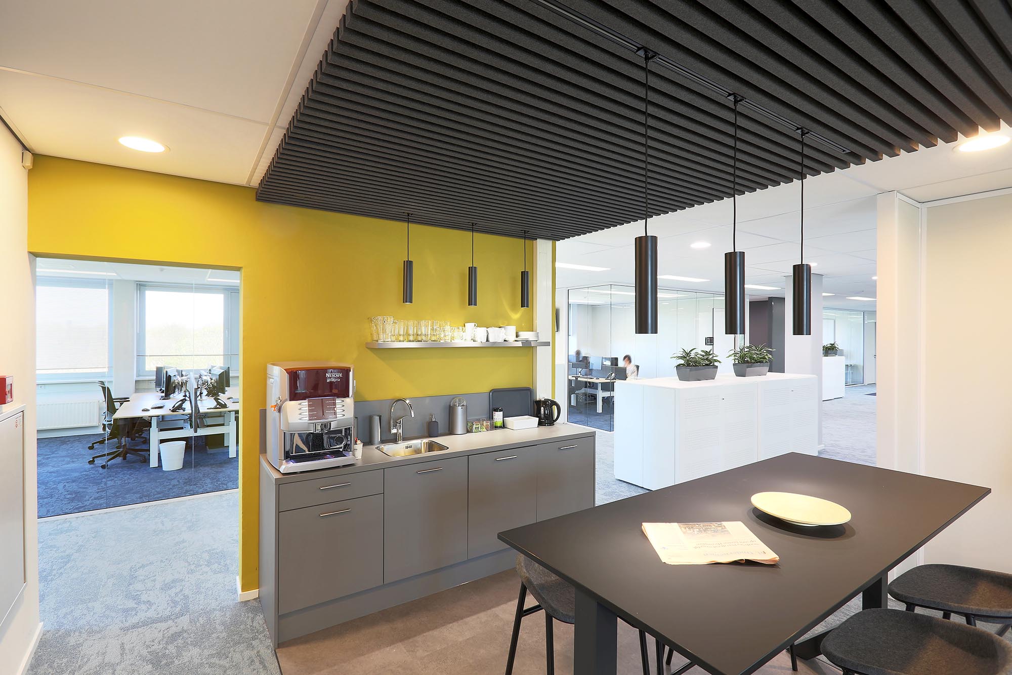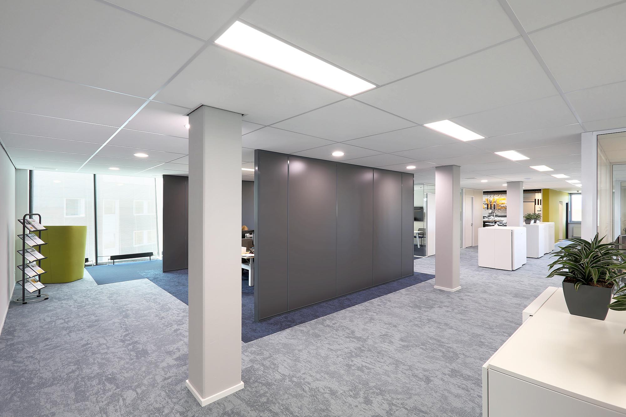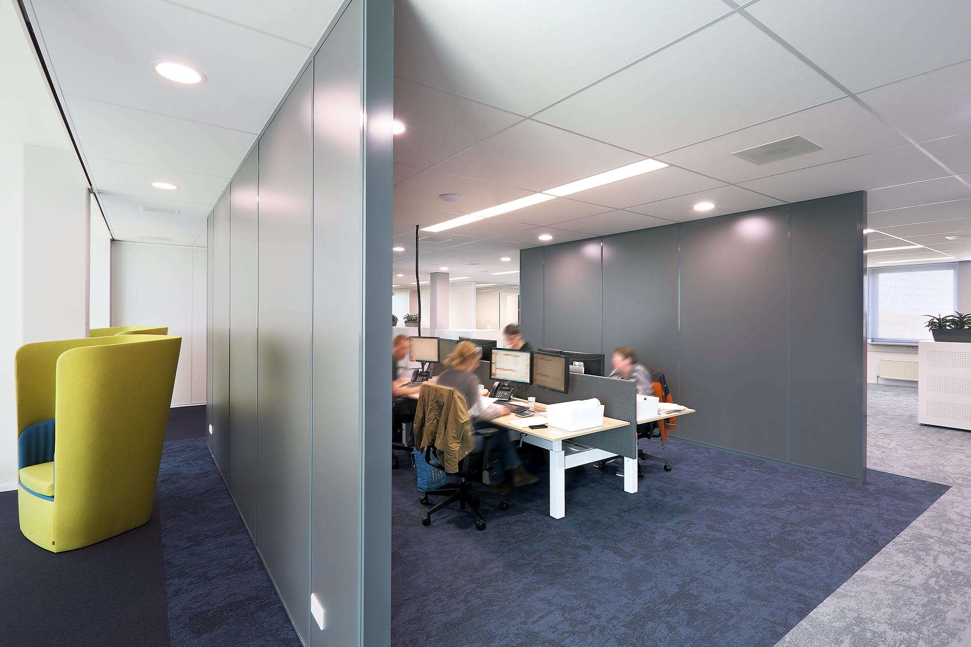 Intermontage heeft binnen het bouwteam de systeemwanden en plafonds verzorgd. Door het open karakter is de akoestiek belangrijk. Daarom is voor het plafond gekozen voor Rockfon Krios plafondpanelen, met een royale afmeting van 1200 x 1200, dat tevens bijdraagt aan het rustige beeld . Bij de pantry’s en de wachtruimte zijn er velden aangebracht met Heartfelt lamellen van Hunter Douglas. Voor de wanden is een combinatie van gesloten wanden (TC-lijn) en glazen wanden (HGS-lijn) toegepast, hetgeen resulteert in een open, rustige en prettige werkomgeving.
