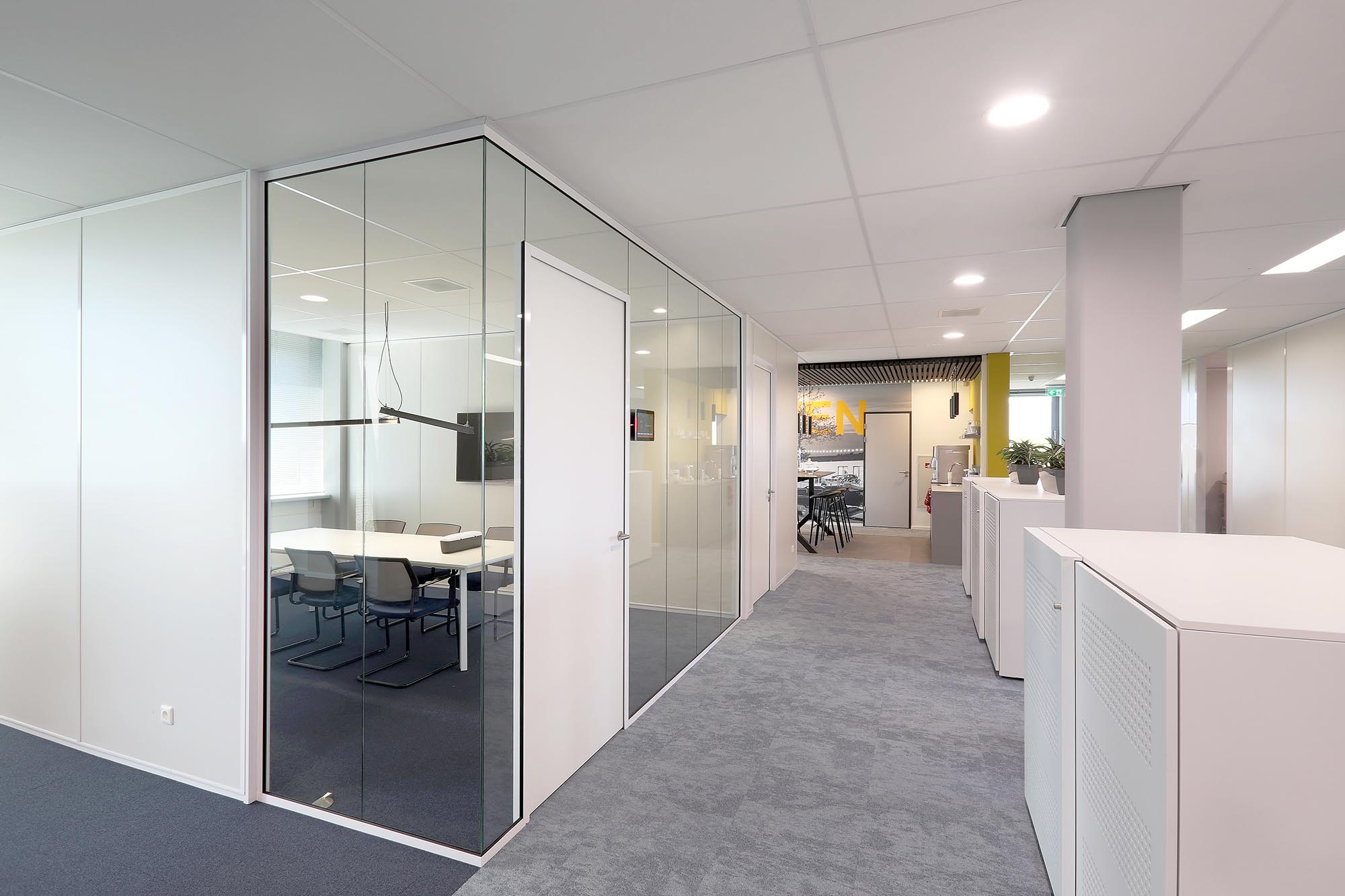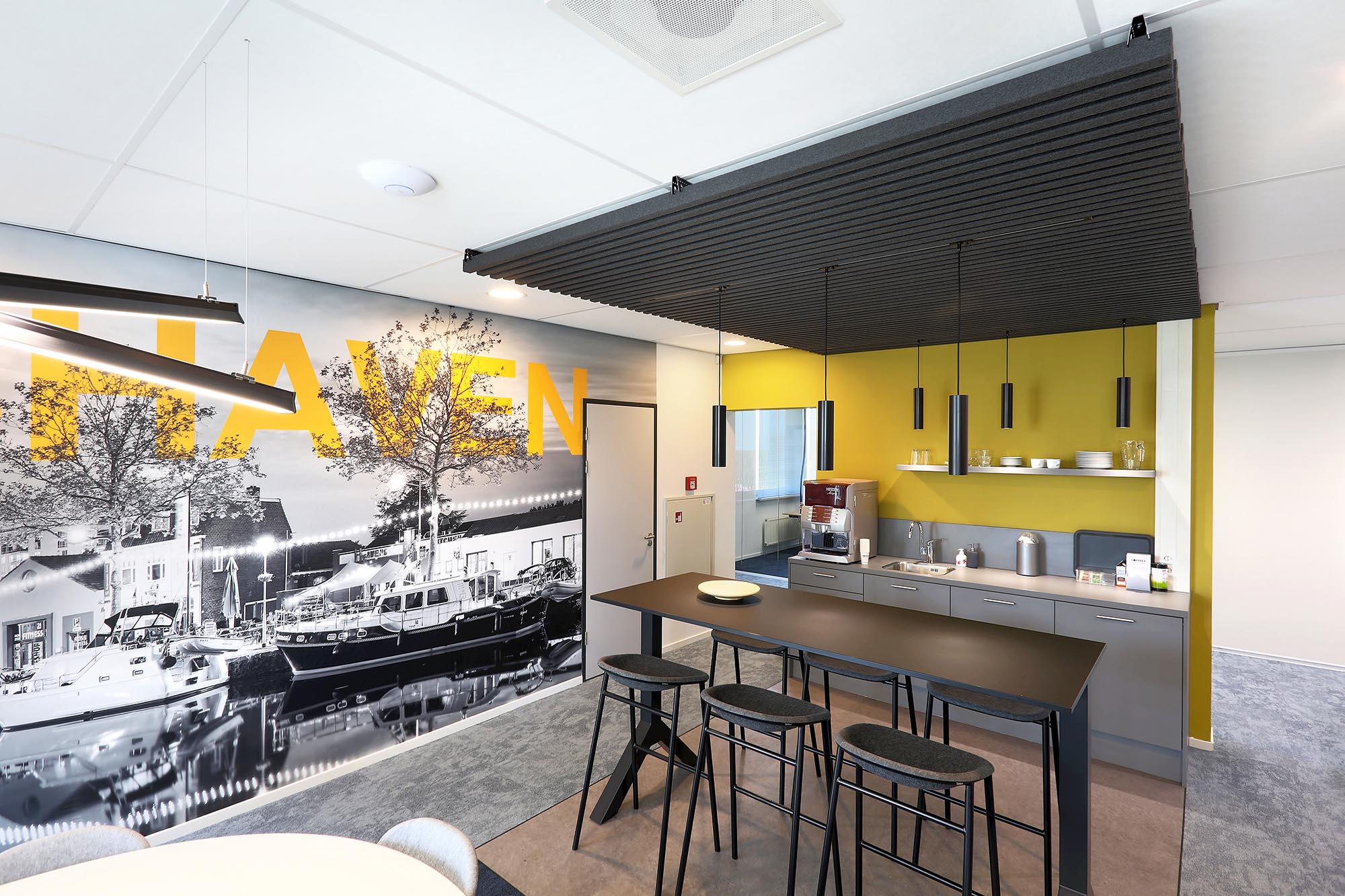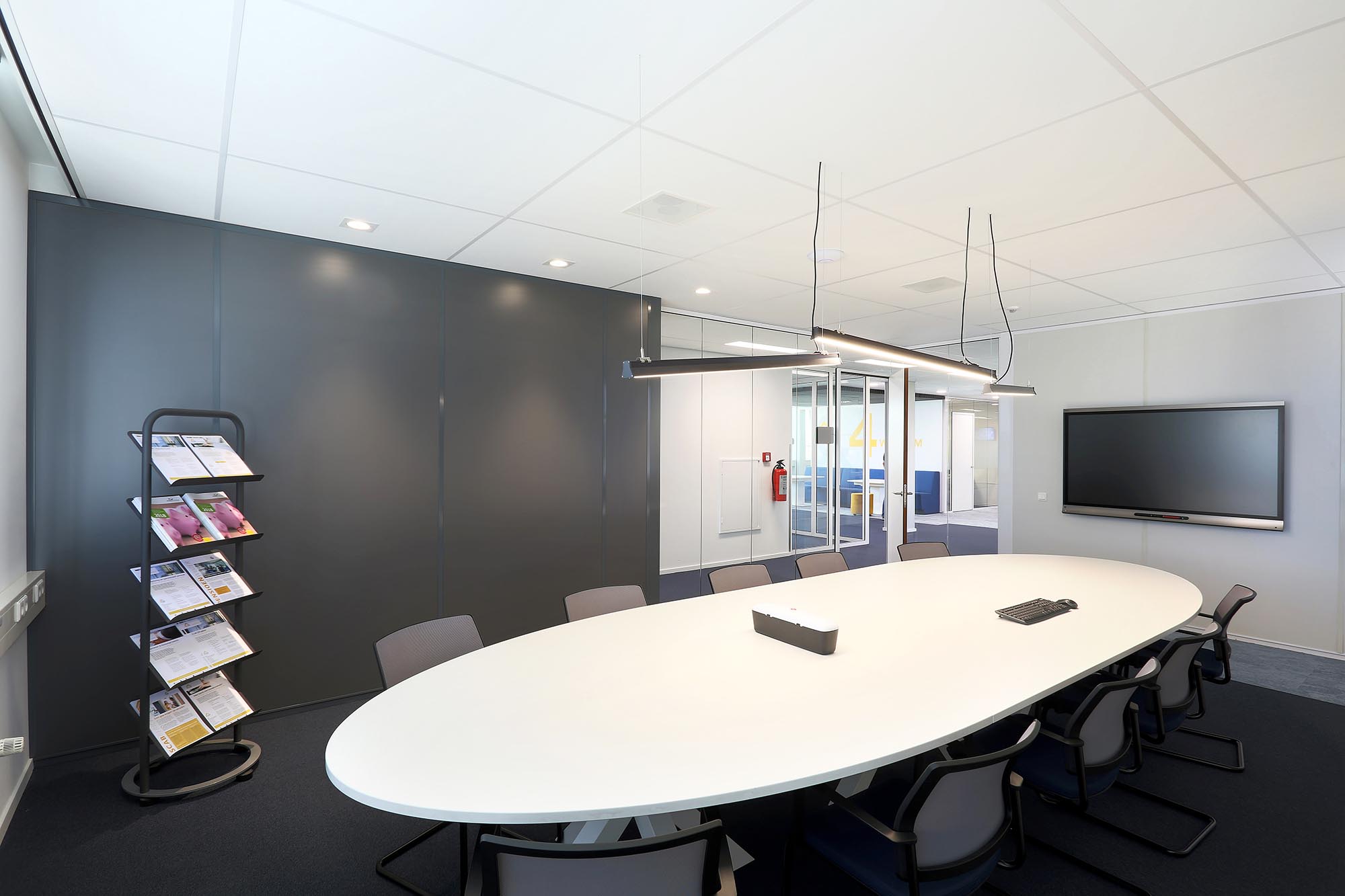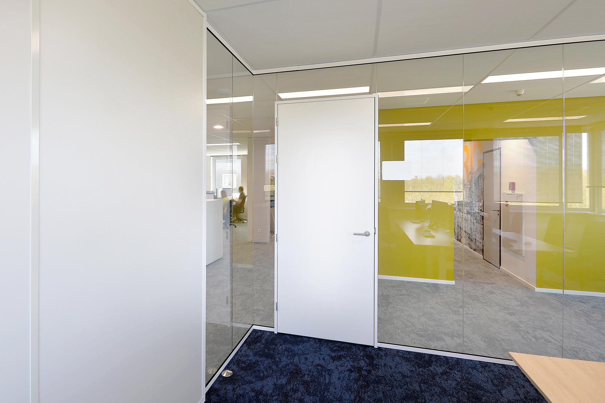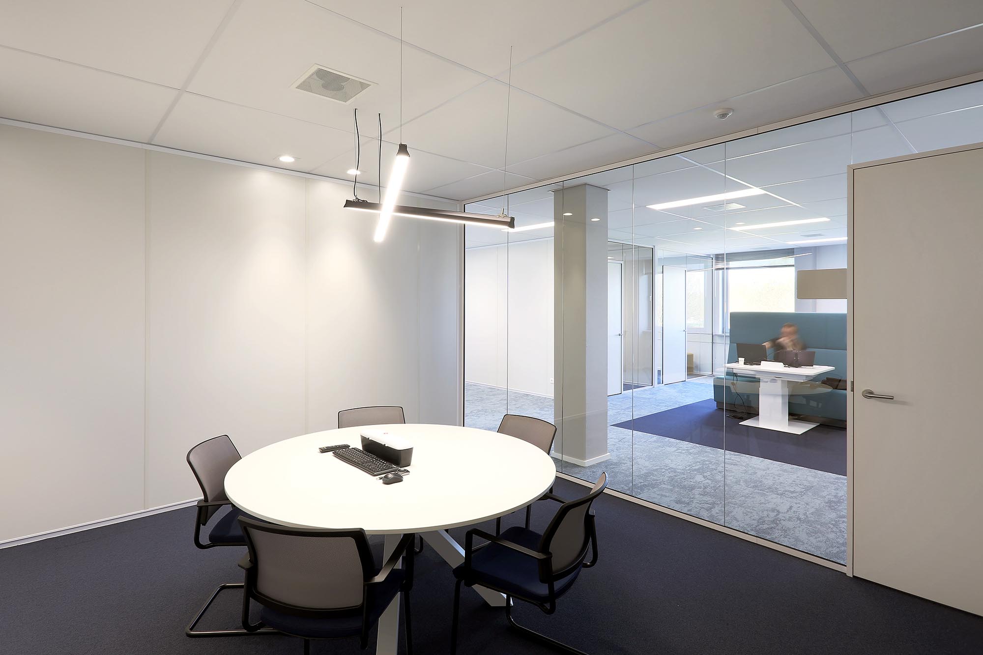 Intermontage heeft binnen het bouwteam de systeemwanden en plafonds verzorgd. Door het open karakter is de akoestiek belangrijk. Daarom is voor het plafond gekozen voor Rockfon Krios plafondpanelen, met een royale afmeting van 1200 x 1200, dat tevens bijdraagt aan het rustige beeld . Bij de pantry’s en de wachtruimte zijn er velden aangebracht met Heartfelt lamellen van Hunter Douglas. Voor de wanden is een combinatie van gesloten wanden (TC-lijn) en glazen wanden (HGS-lijn) toegepast, hetgeen resulteert in een open, rustige en prettige werkomgeving.
