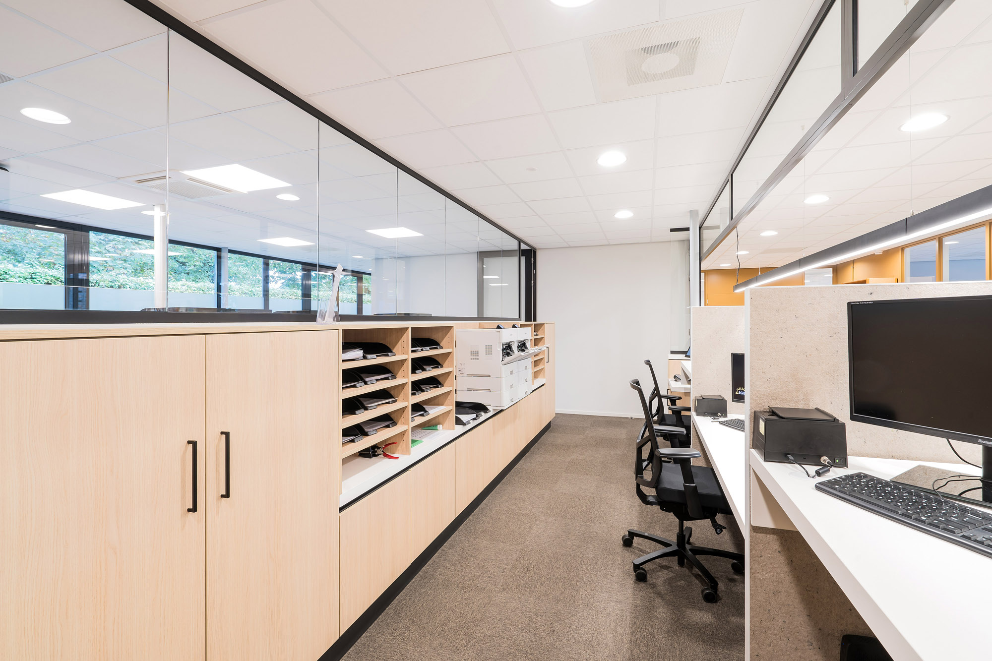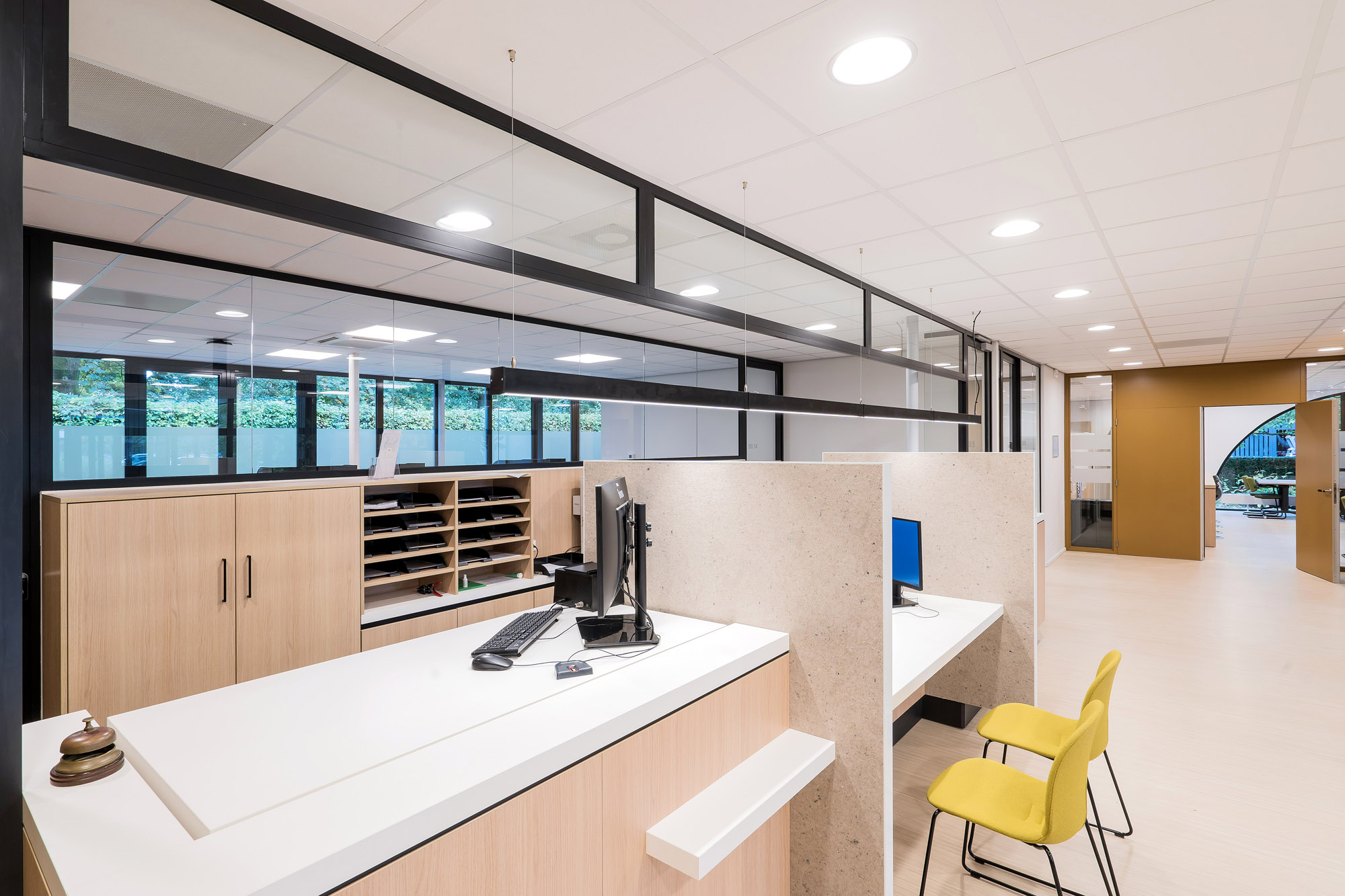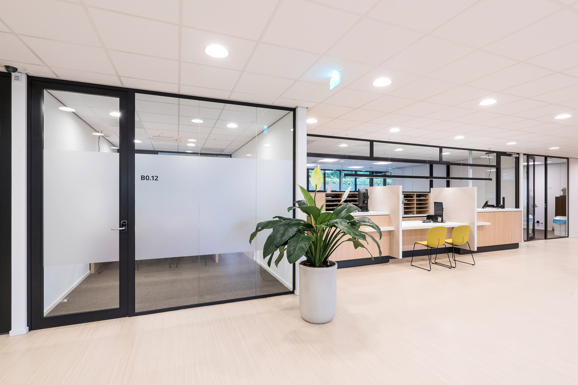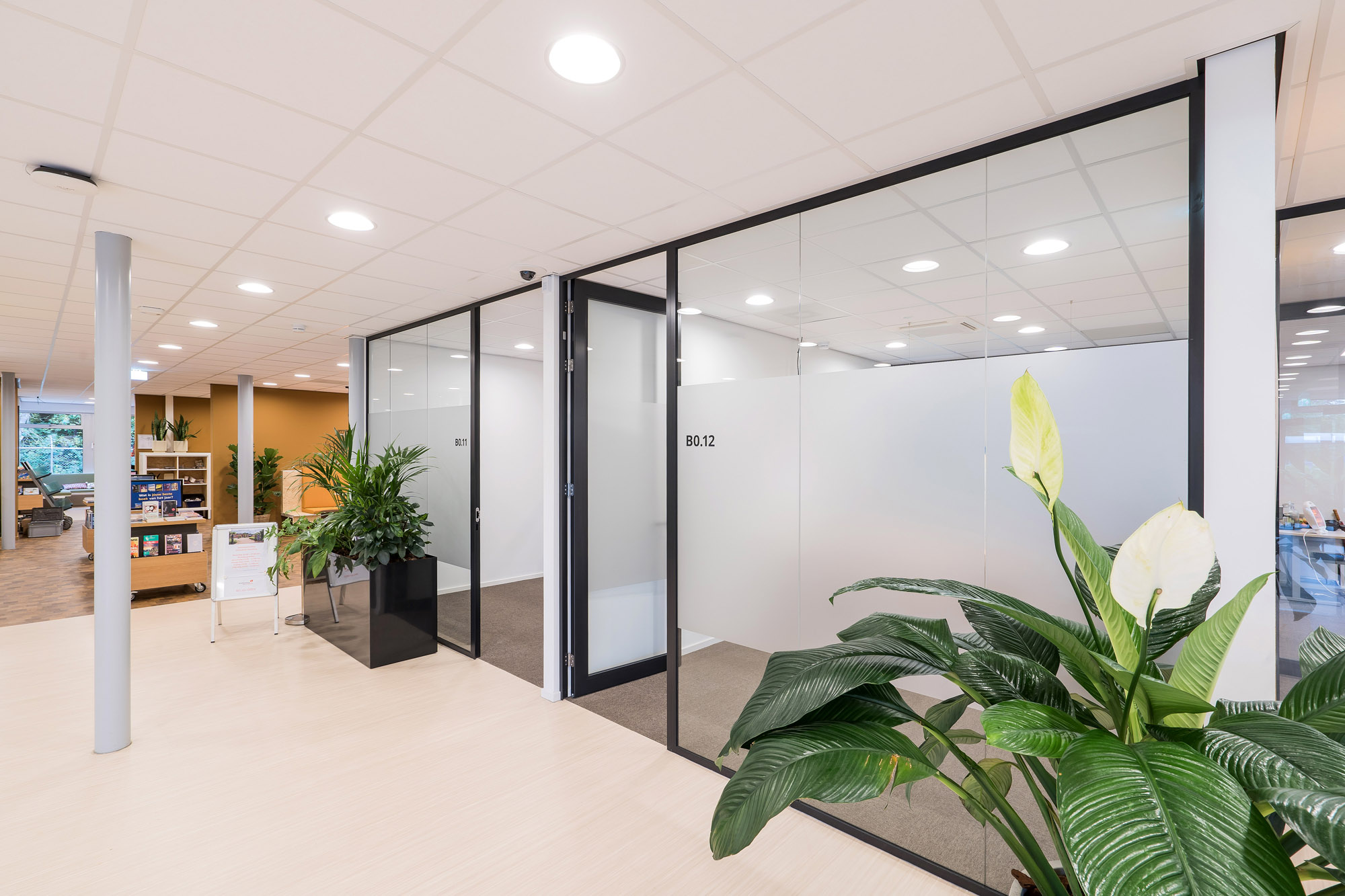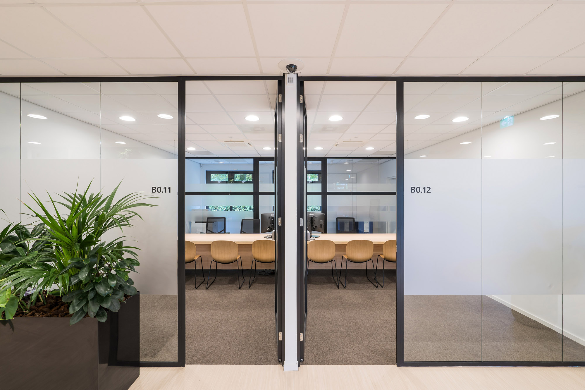 De glazen systeemwanden met slanke kaderdeuren zorgen voor voldoende privacy zonder in te boeten op de openheid van het kantoorpand. De slanke kaderdeuren zijn voorzien van valdorpels voor extra akoestisch comfort. Om de akoestiek verder te verbeteren is er een akoestisch plafond toegepast met Rockfon Color-all panelen. Deze zijn te leveren in zichtbare, doorzak en verdekte kantafwerking voor een grote ontwerpvrijheid.