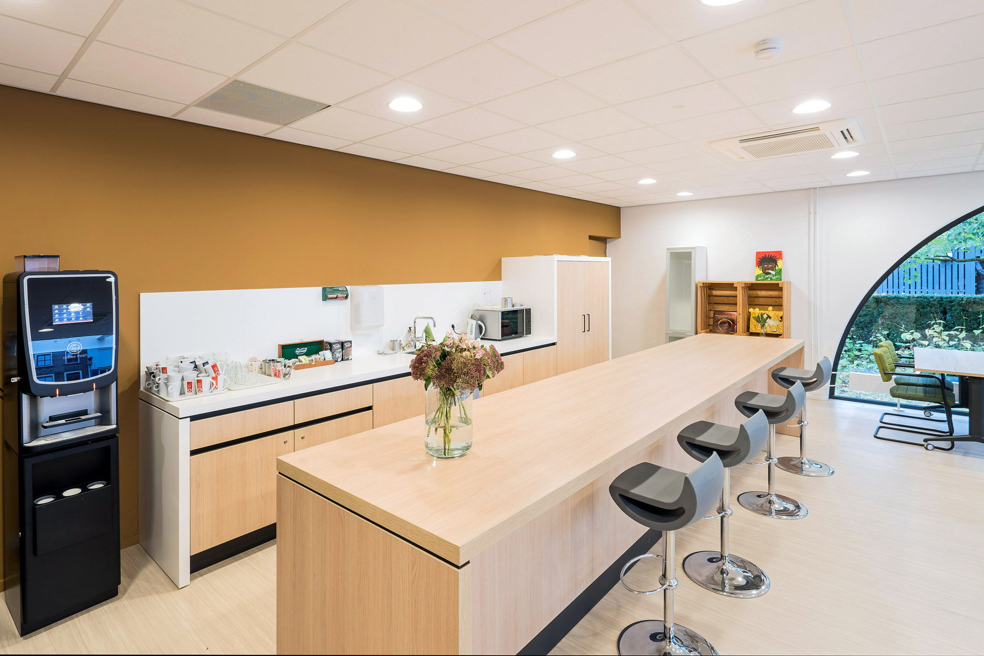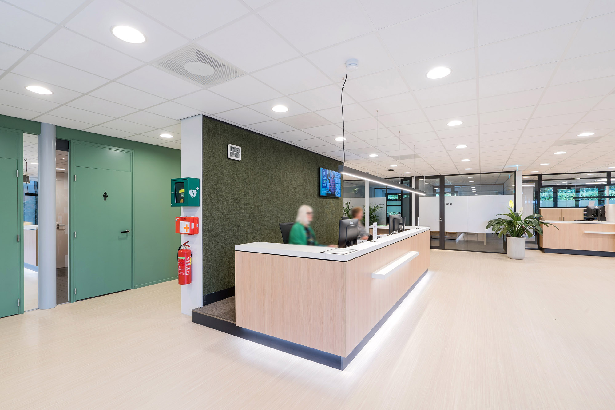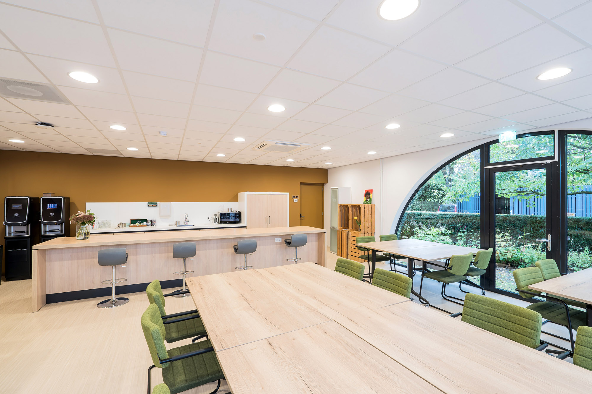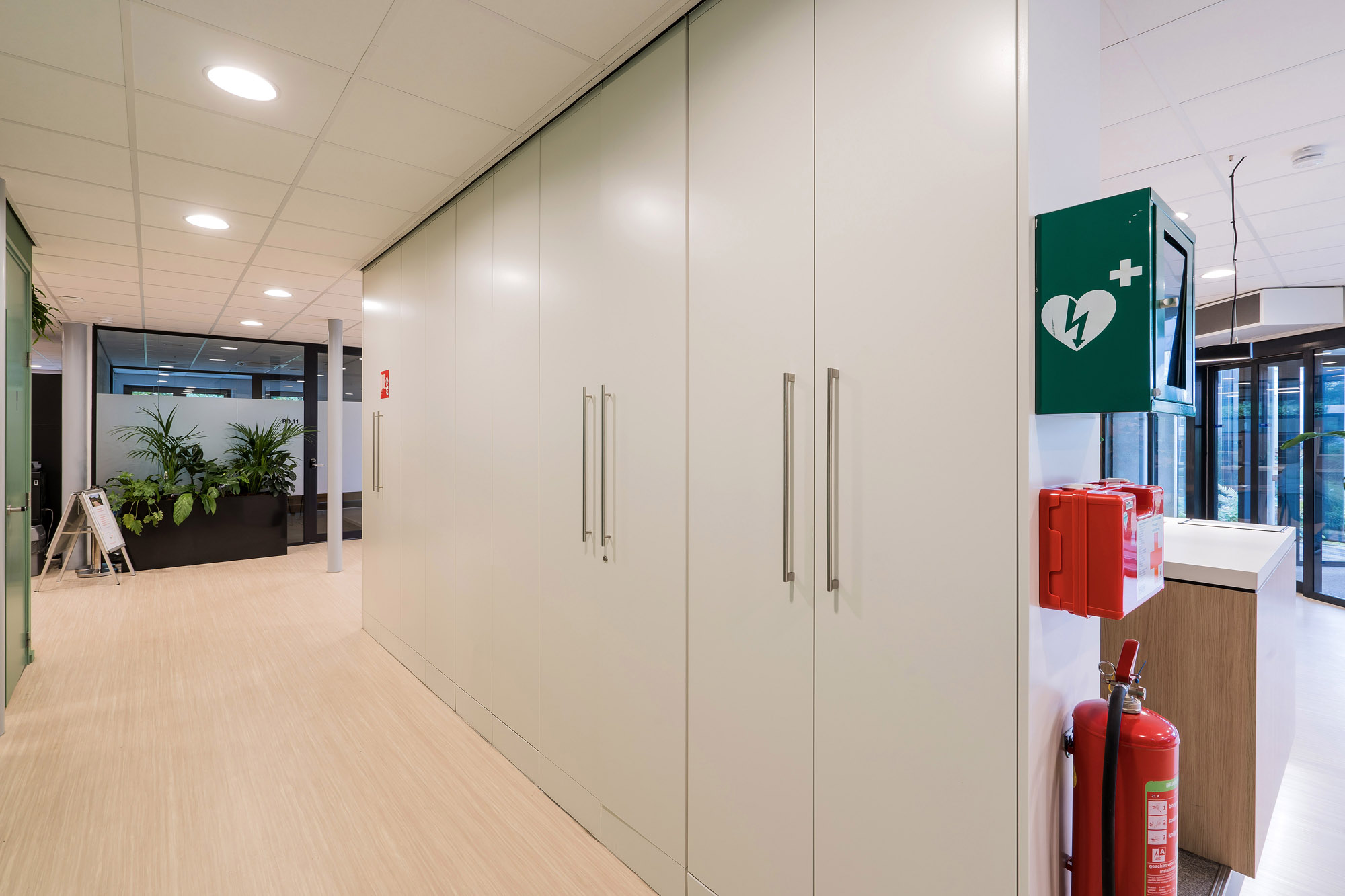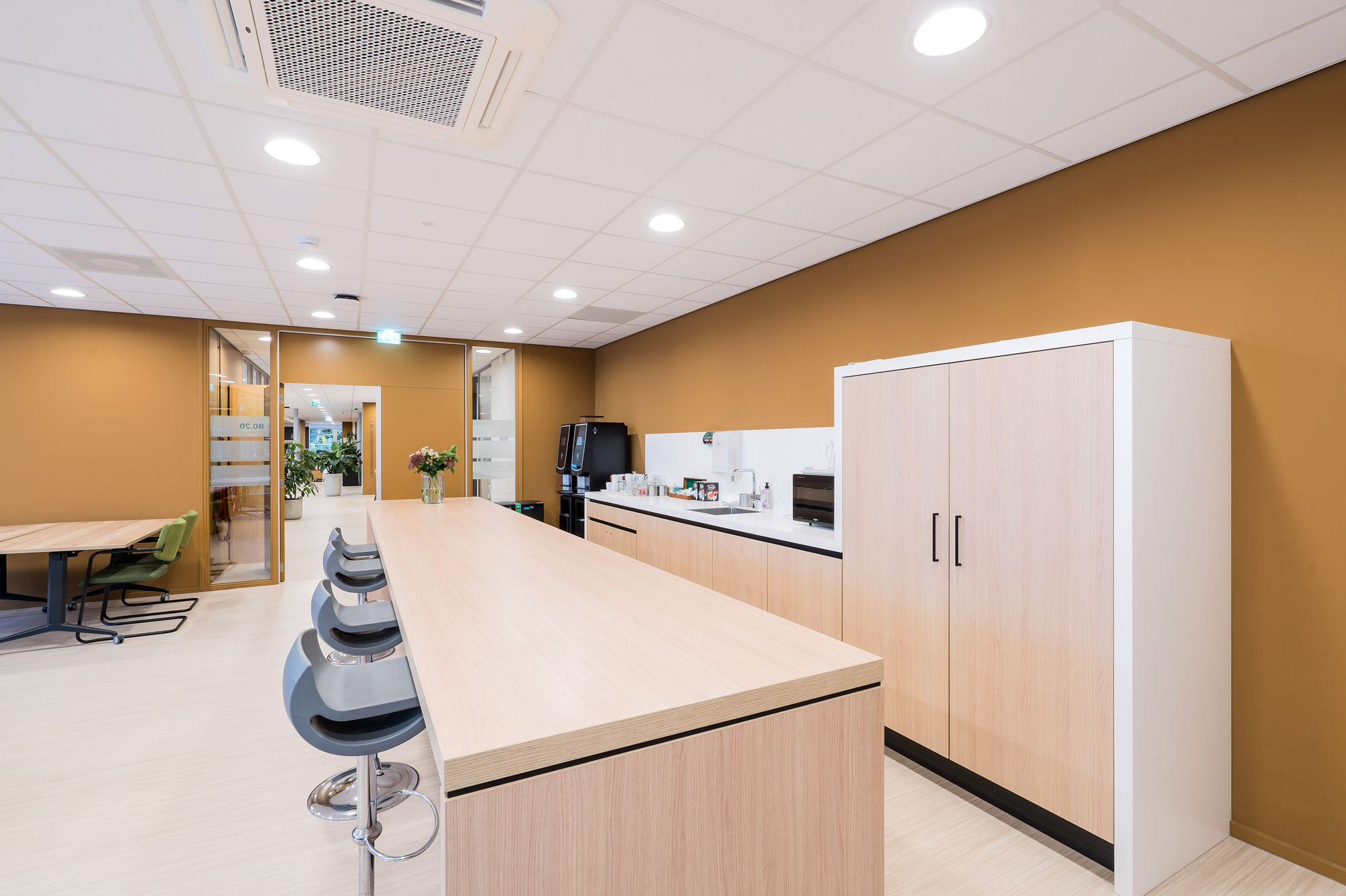 De glazen systeemwanden met slanke kaderdeuren zorgen voor voldoende privacy zonder in te boeten op de openheid van het kantoorpand. De slanke kaderdeuren zijn voorzien van valdorpels voor extra akoestisch comfort. Om de akoestiek verder te verbeteren is er een akoestisch plafond toegepast met Rockfon Color-all panelen. Deze zijn te leveren in zichtbare, doorzak en verdekte kantafwerking voor een grote ontwerpvrijheid.