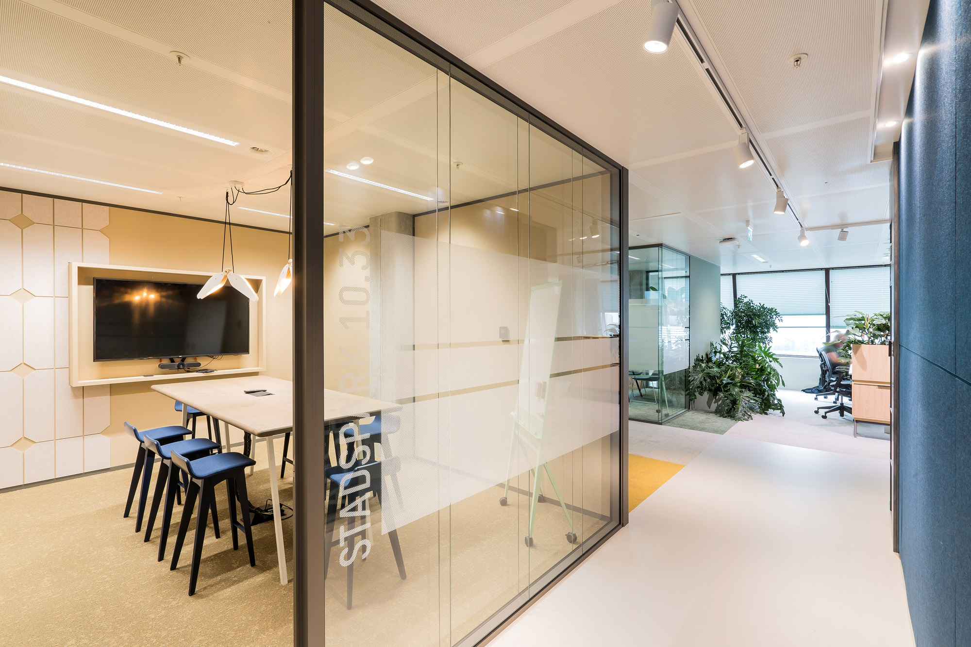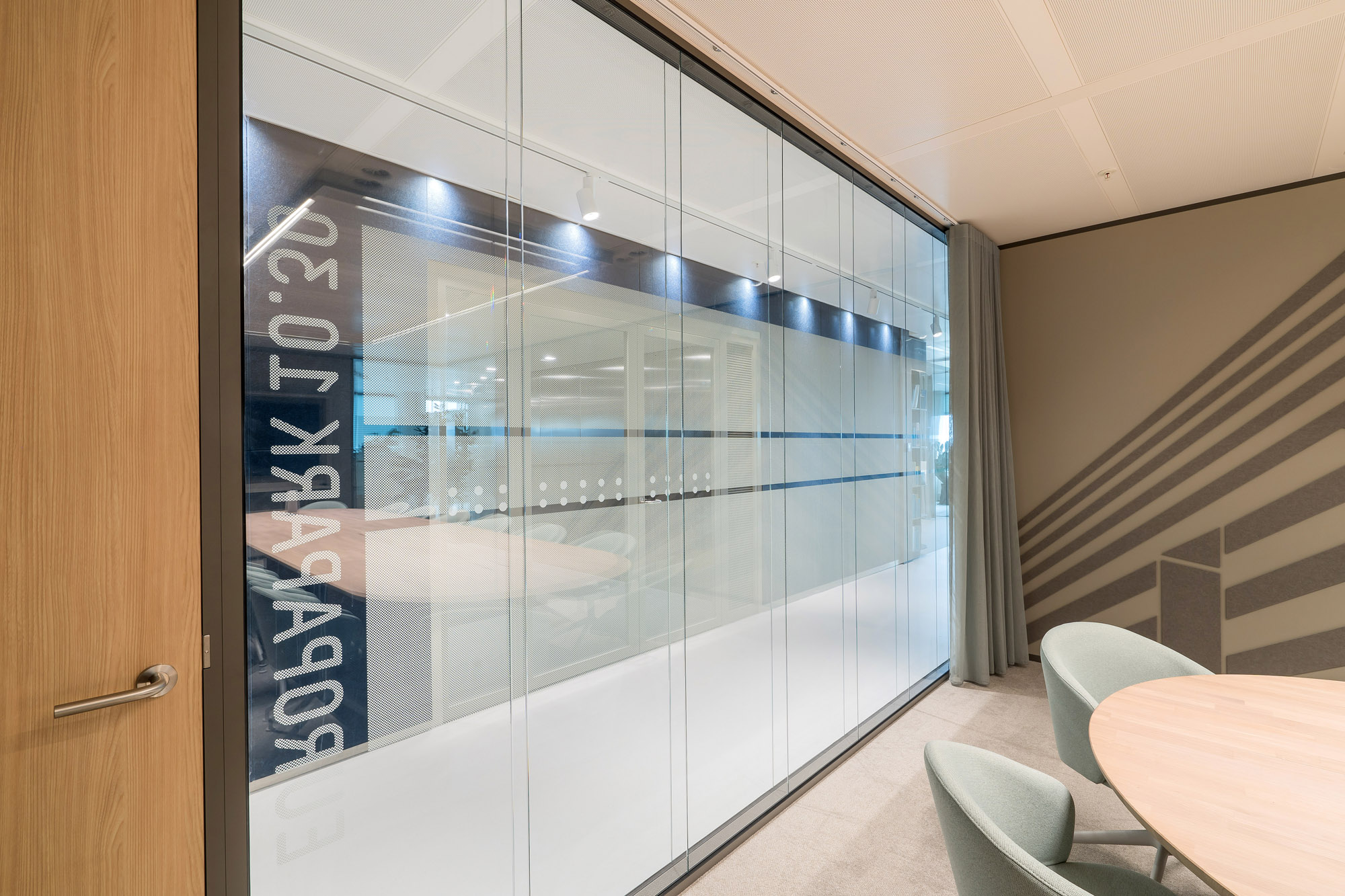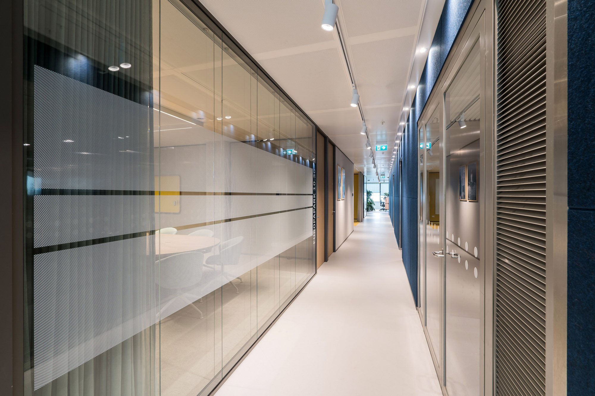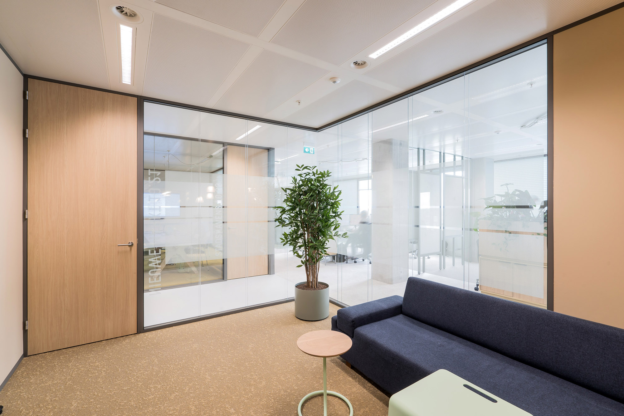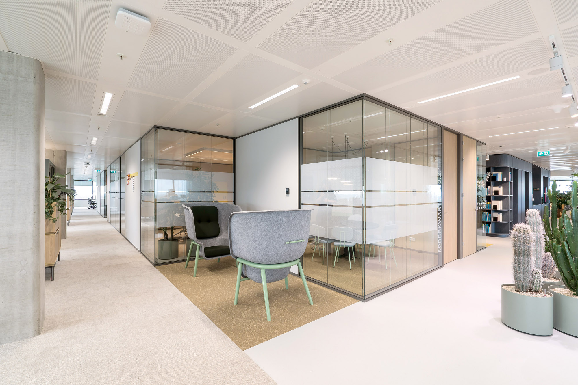 De nadruk in het ontwerp qua systeemwanden lag op transparantie én een hoge geluidsisolatiewaarde. Daarom is gekozen voor TWIN-glaswanden in combinatie met gesloten wanden. Onze TWIN, een dubbelwandige glazen systeemwand, blinkt uit met een hoge geluidsisolatie met behoud van transparantie. De TWIN is uitermate geschikt om toe te passen in overlegplekken op de werkvloer. De hoge mate van privacy, goede akoestiek en de huiselijke sfeer gecreëerd door Hal2 zorgen voor een prettige werkomgeving waar werk, ontmoeting en inspiratie samenkomen.