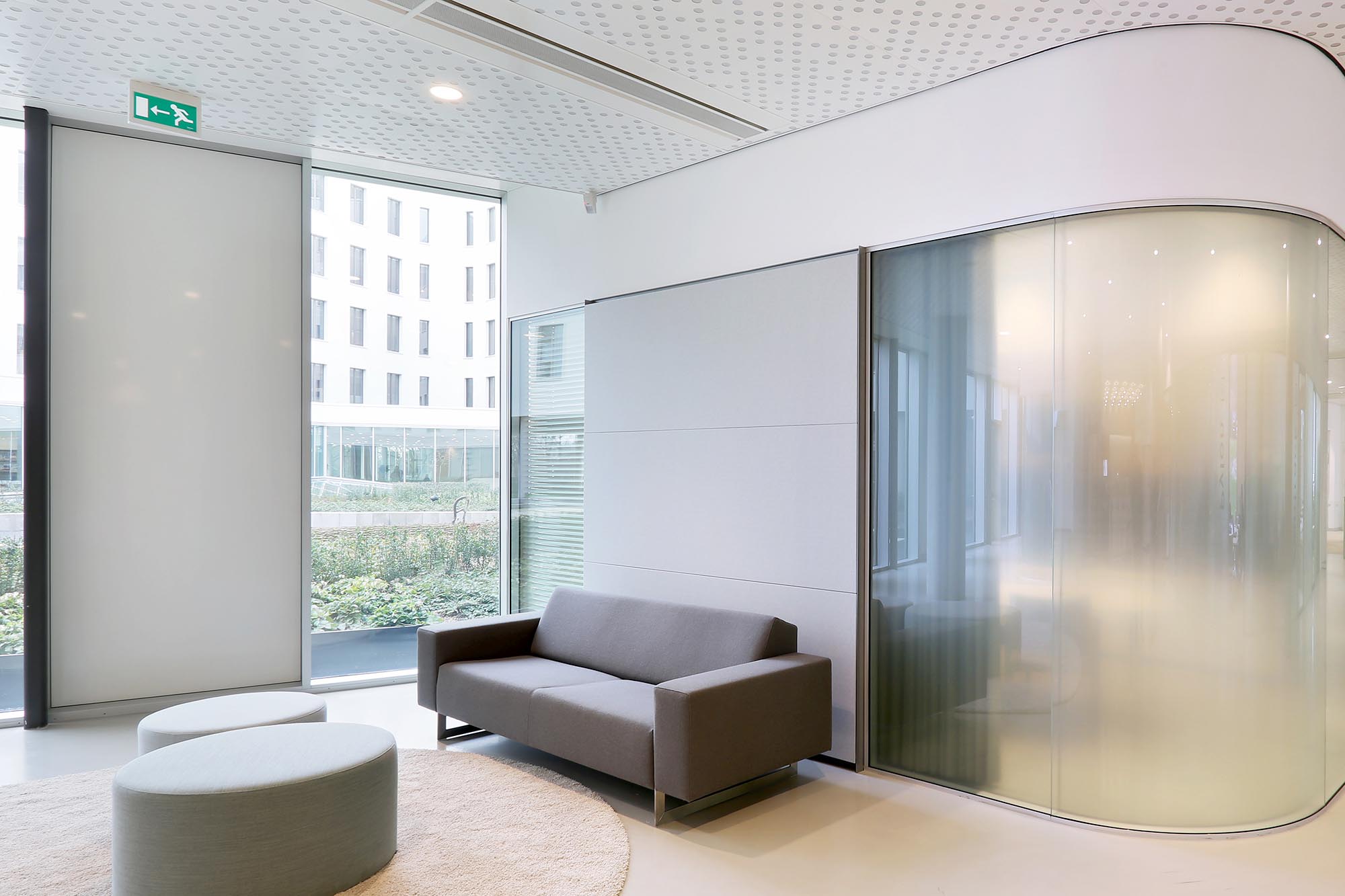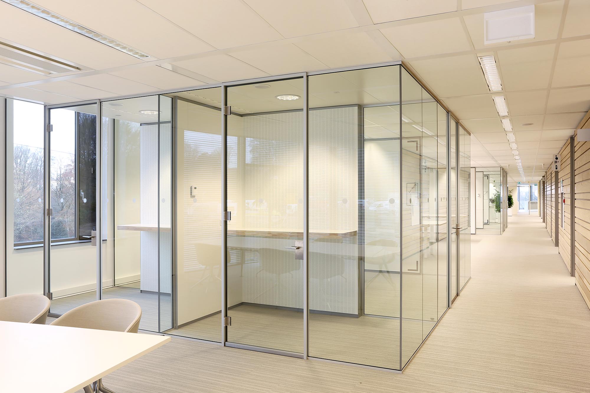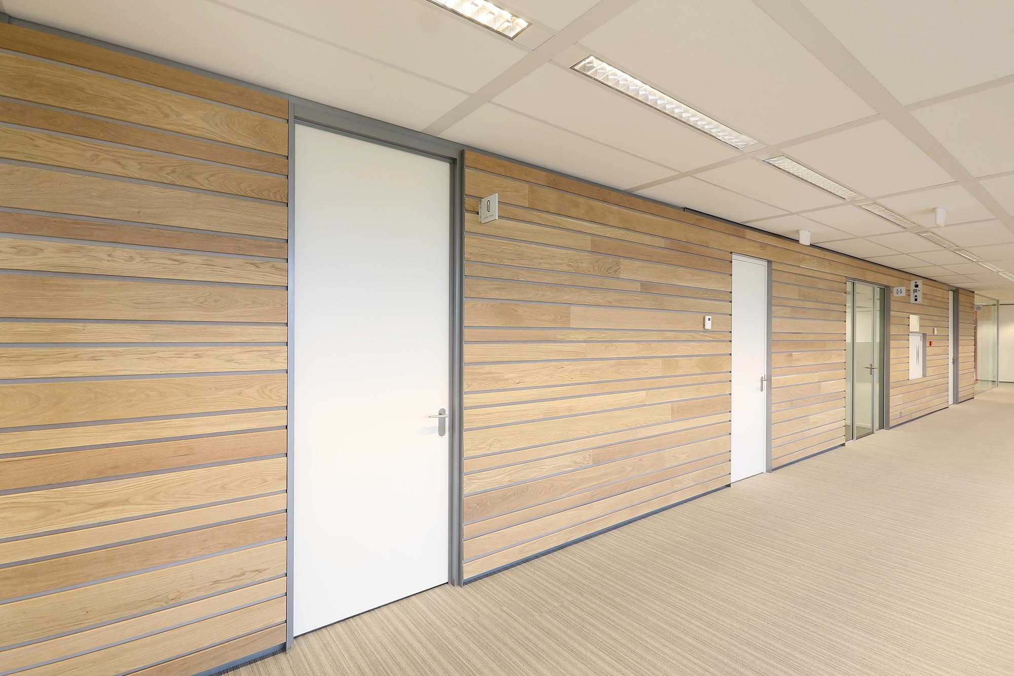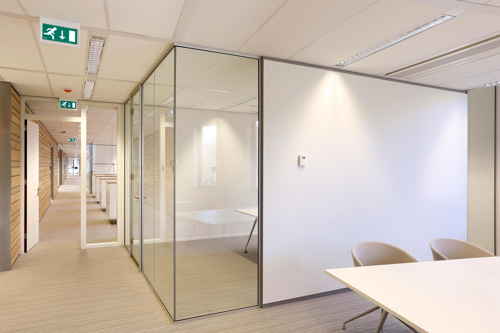 De geluidsisolatiewaarden van de wanden variëren van Rw=38dB t/m Rw=54dB en zijn ingedeeld naar de wens van de gebruiker. Zo is er een optimale werkomgeving gecreëerd met een hoge mate van privacy. Waar nodig zijn deuren met een geluidsisolatie van Rw=47dB toegepast in dit project.