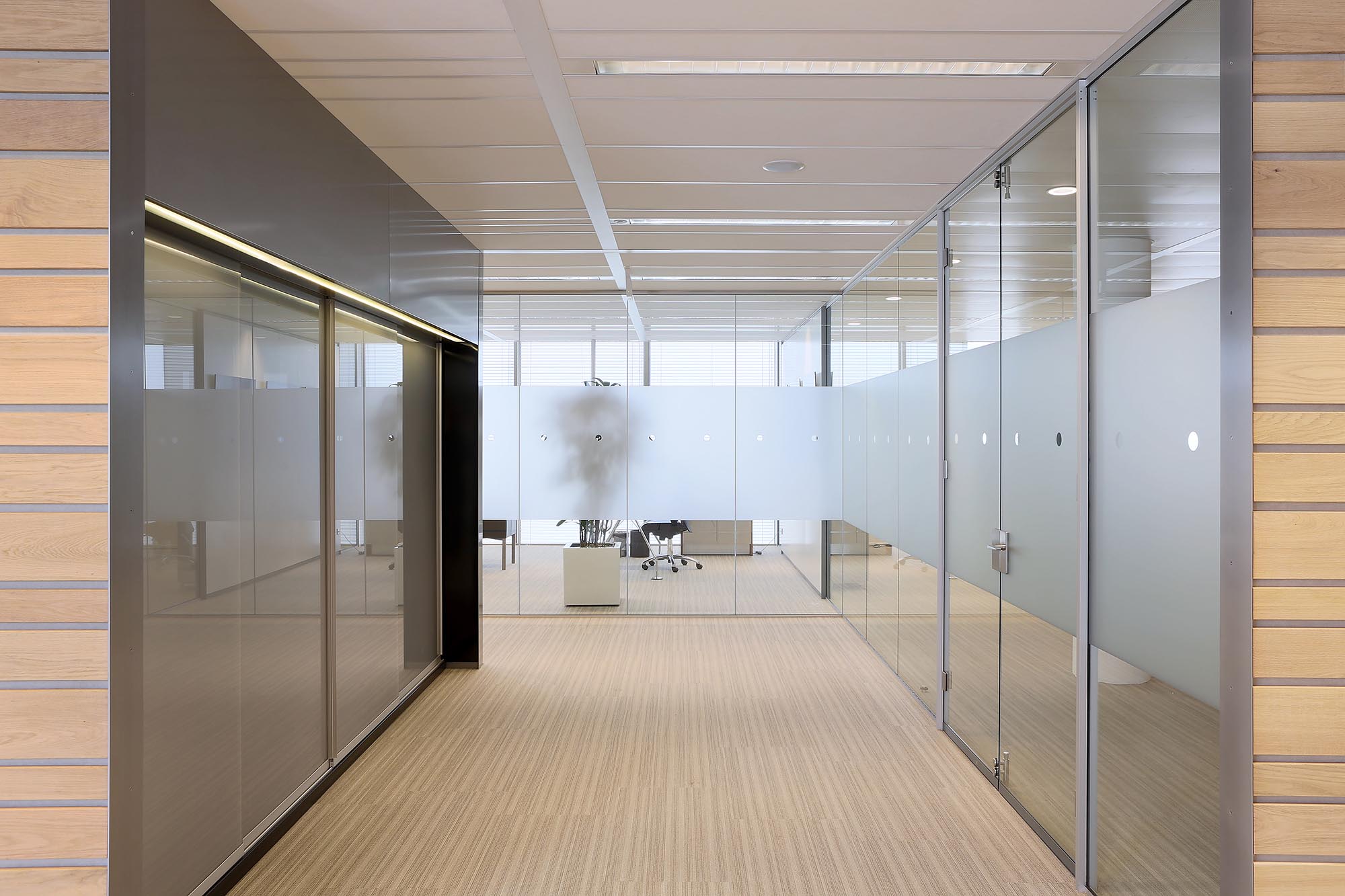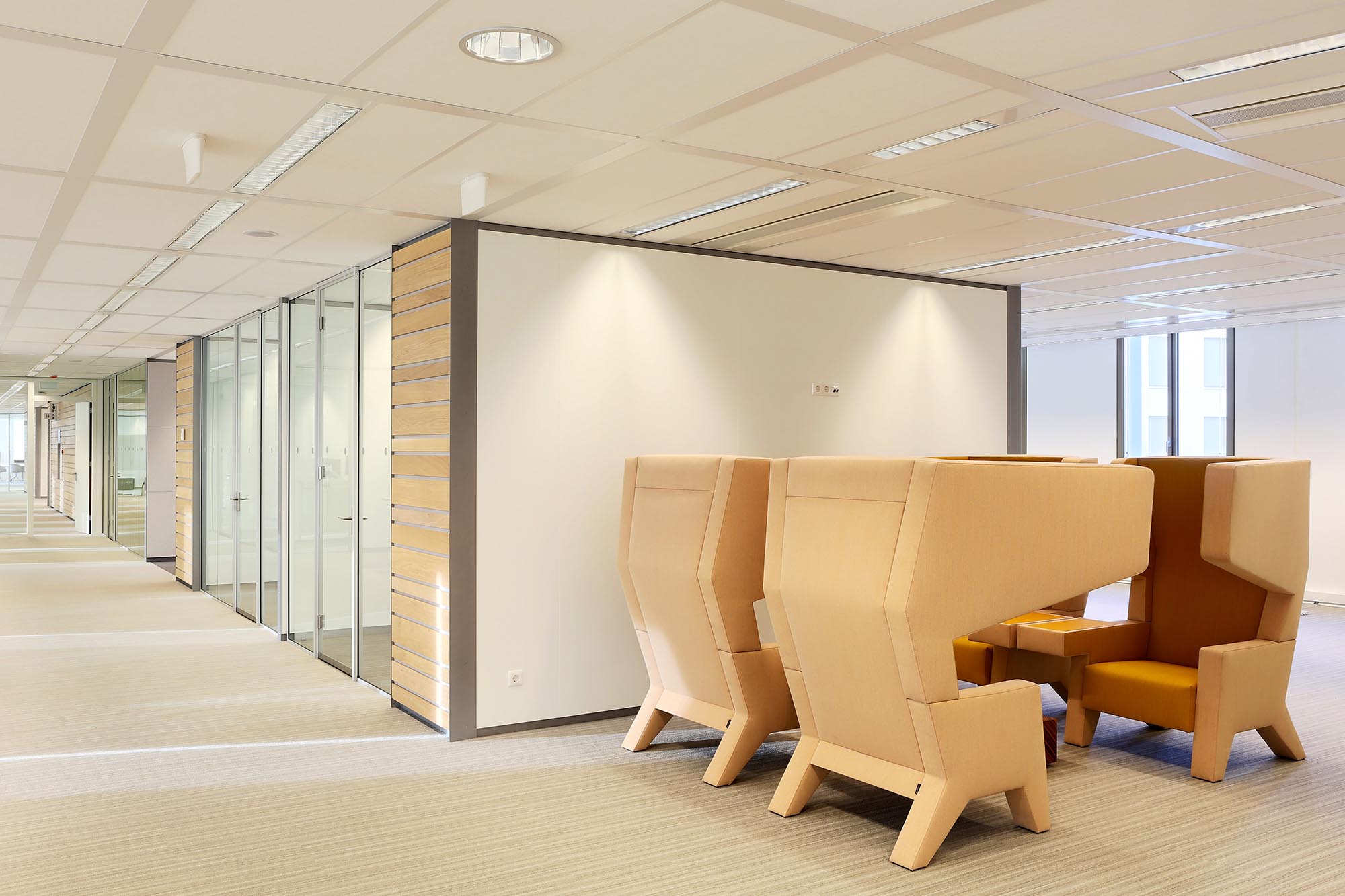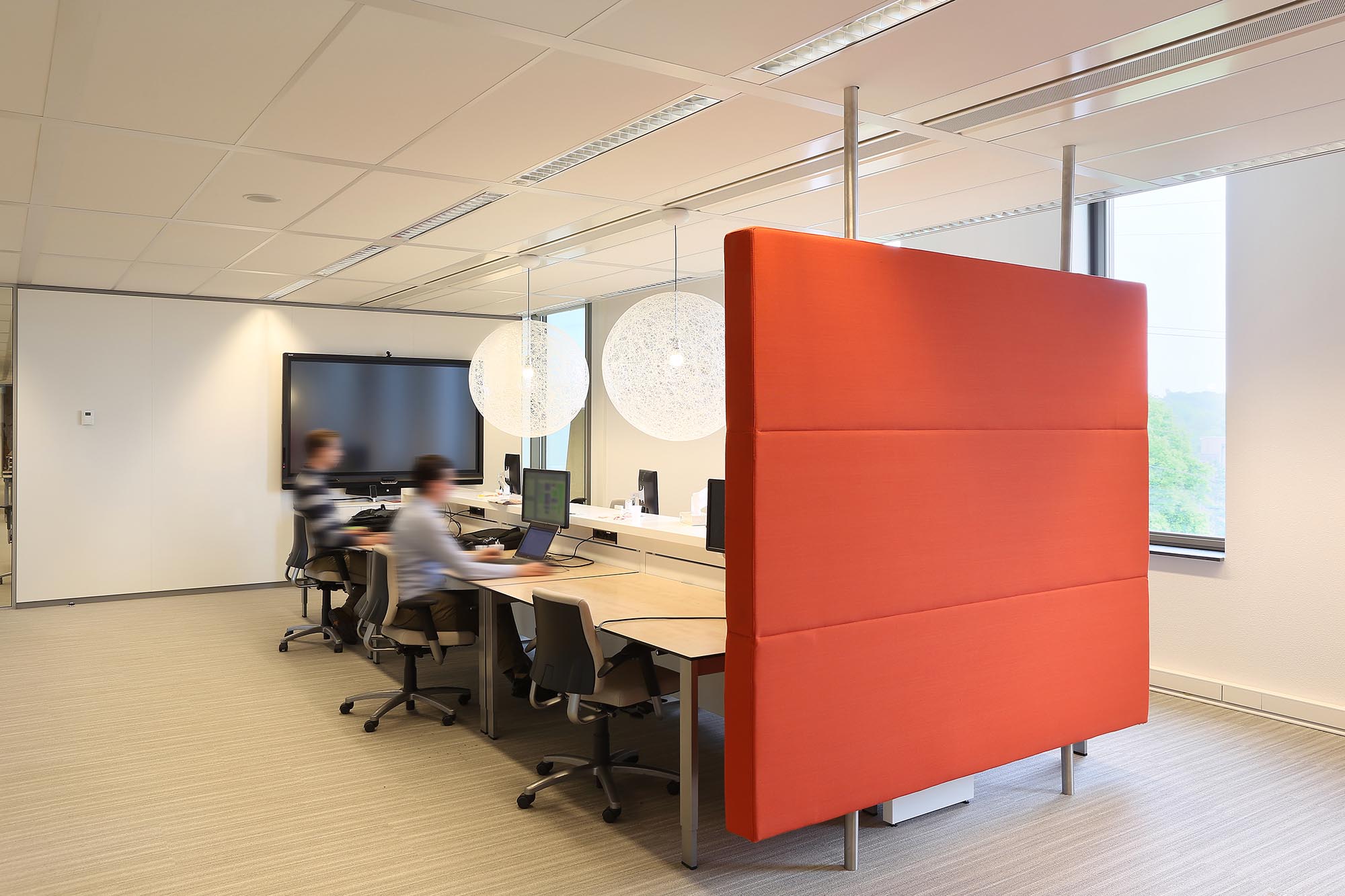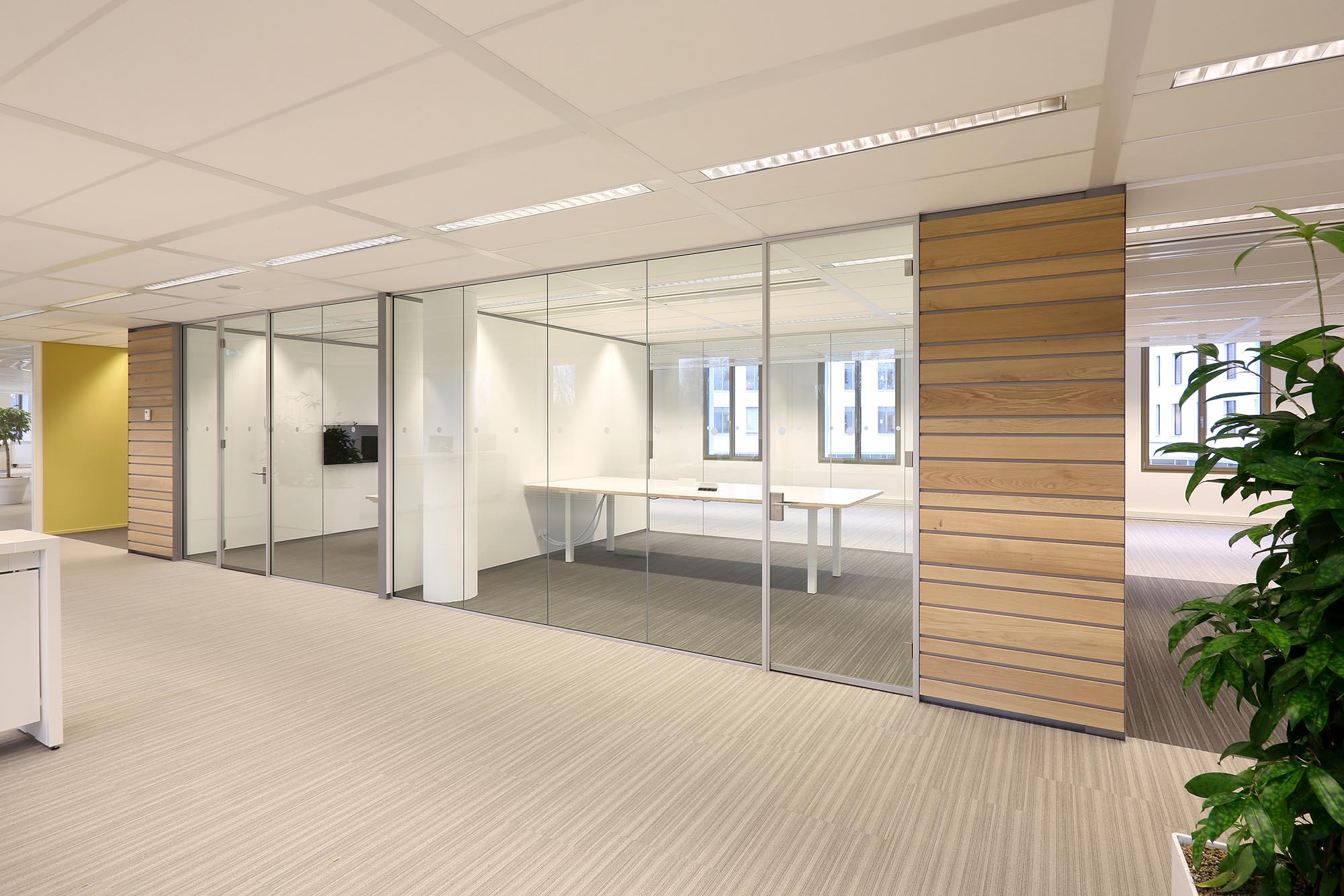 De geluidsisolatiewaarden van de wanden variëren van Rw=38dB t/m Rw=54dB en zijn ingedeeld naar de wens van de gebruiker. Zo is er een optimale werkomgeving gecreëerd met een hoge mate van privacy. Waar nodig zijn deuren met een geluidsisolatie van Rw=47dB toegepast in dit project.