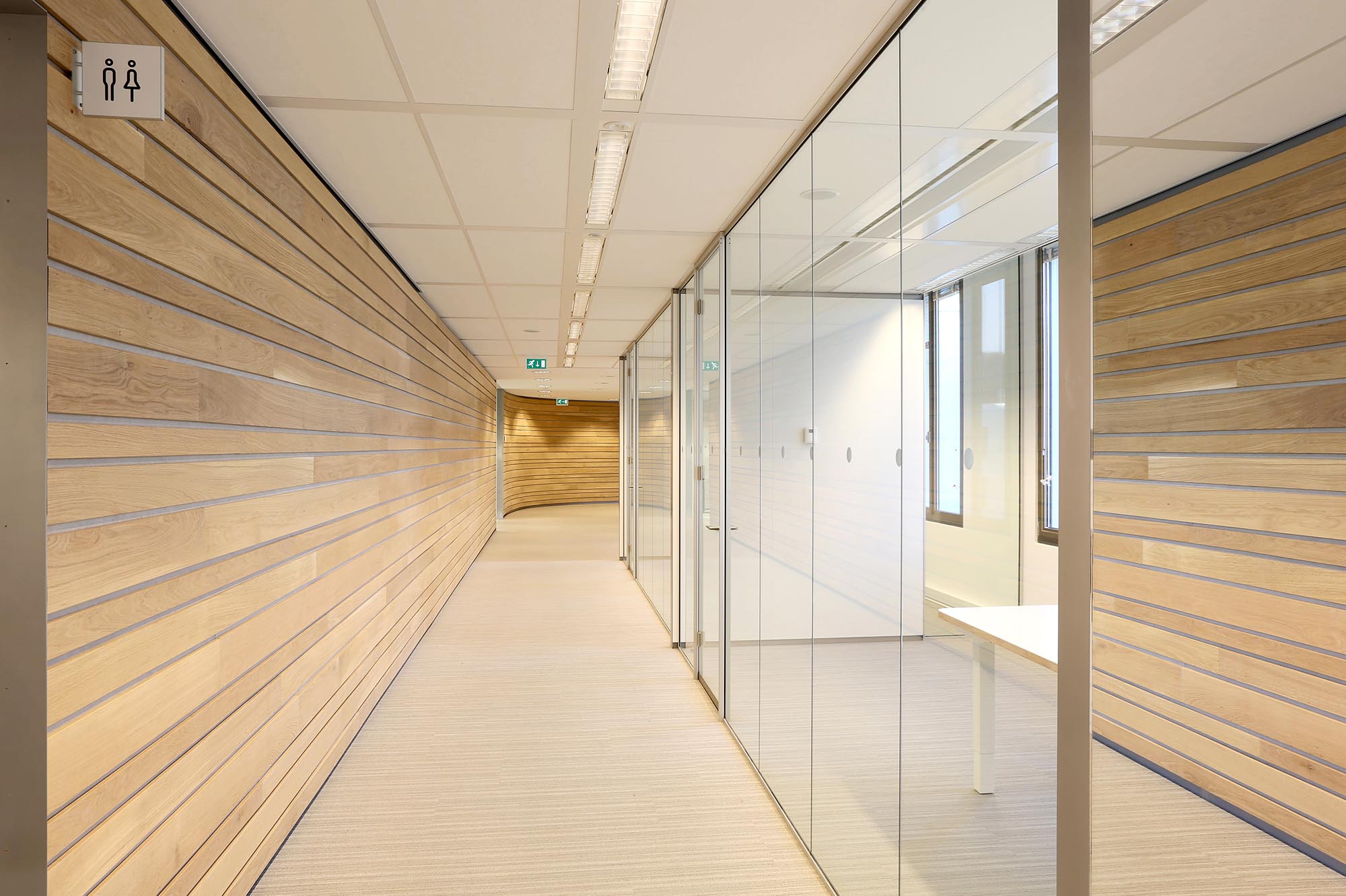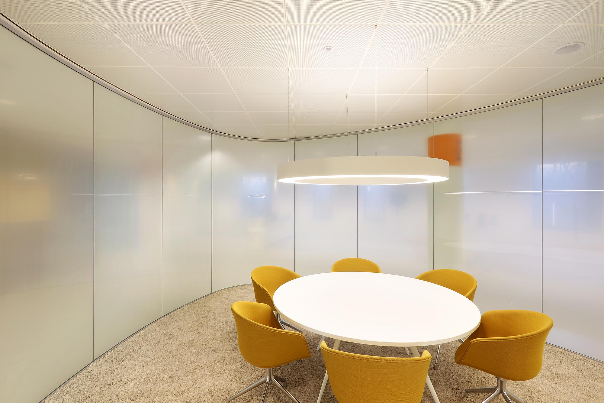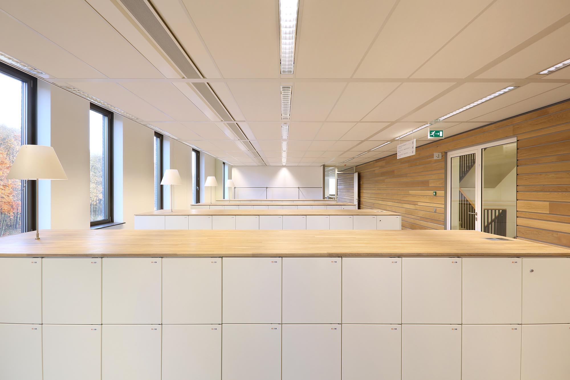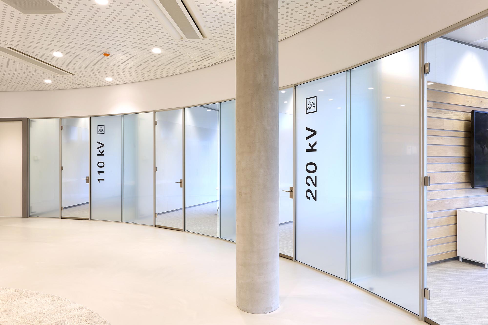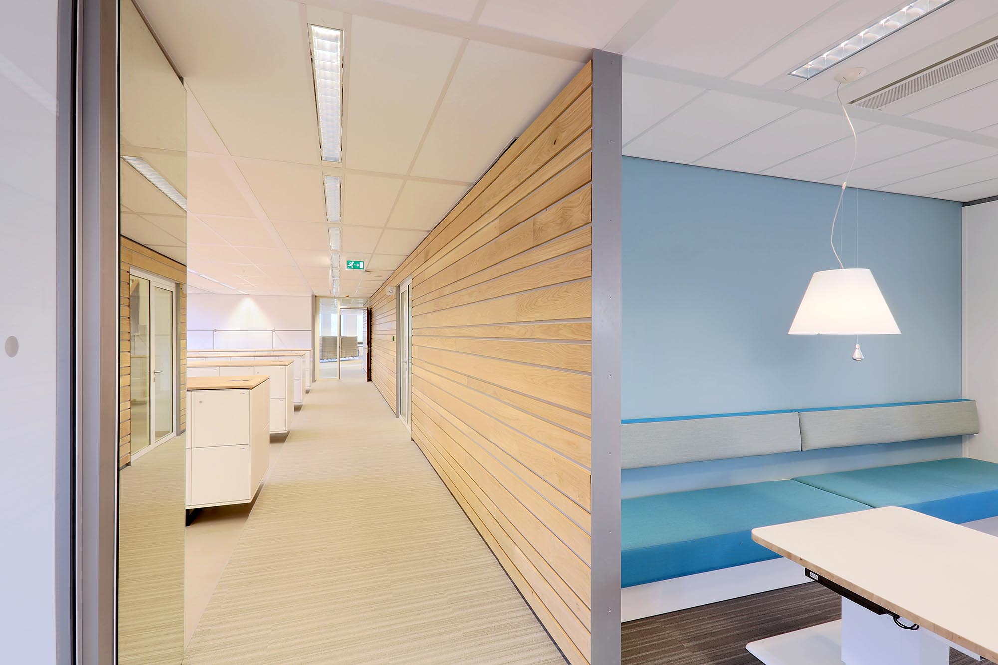 De geluidsisolatiewaarden van de wanden variëren van Rw=38dB t/m Rw=54dB en zijn ingedeeld naar de wens van de gebruiker. Zo is er een optimale werkomgeving gecreëerd met een hoge mate van privacy. Waar nodig zijn deuren met een geluidsisolatie van Rw=47dB toegepast in dit project.