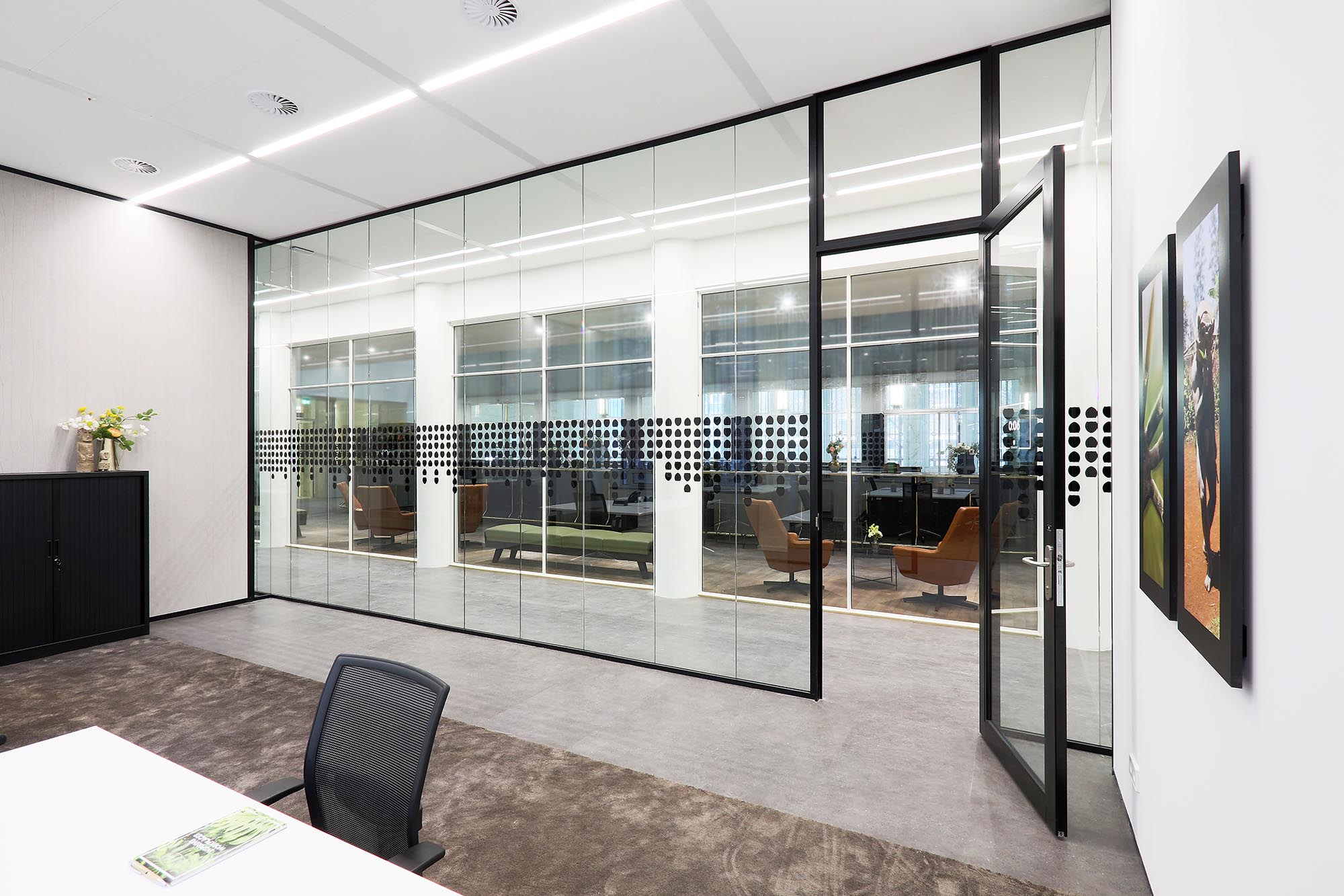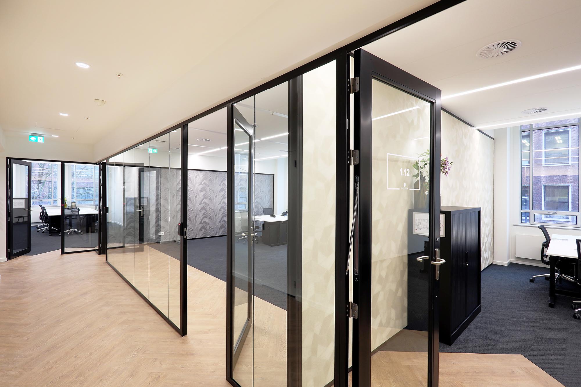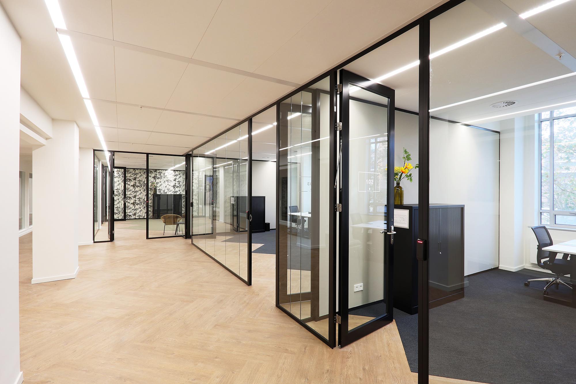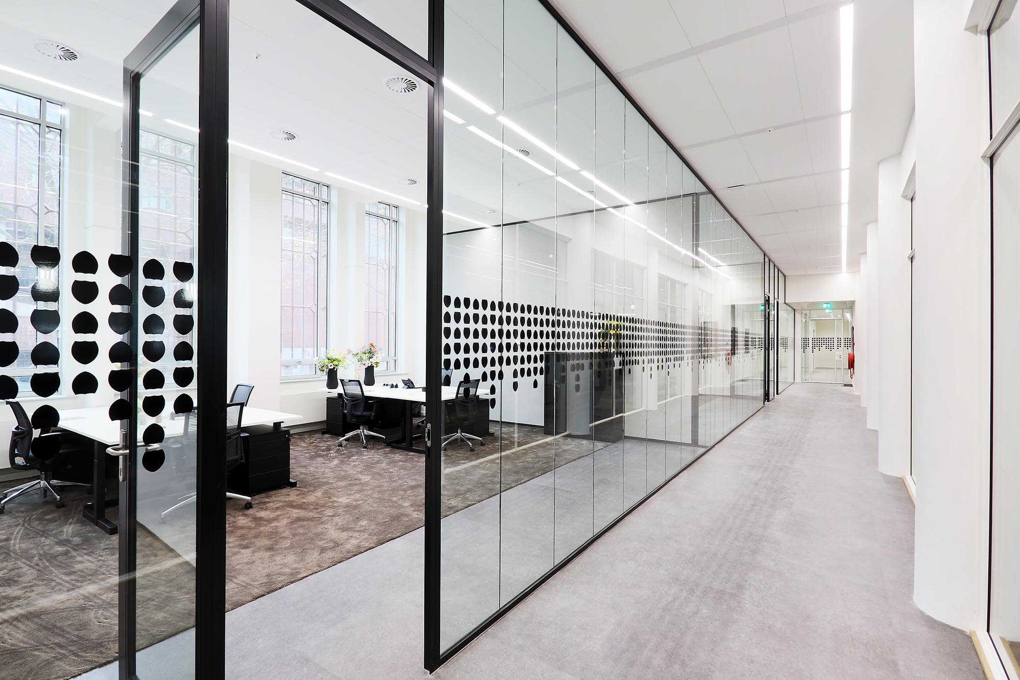 Intermontage heeft voor deze vestiging de tussenwanden (Metalstud de Luxe) en de glazen gangwanden verzorgd. De architecten van Ericis zijn er in geslaagd het monumentale karakter van het pand te vertalen in een frisse, open werkomgeving. Met glaswanden tot 3600 mm hoog wordt er zoveel mogelijk gebruik gemaakt van het bestaande daglicht.