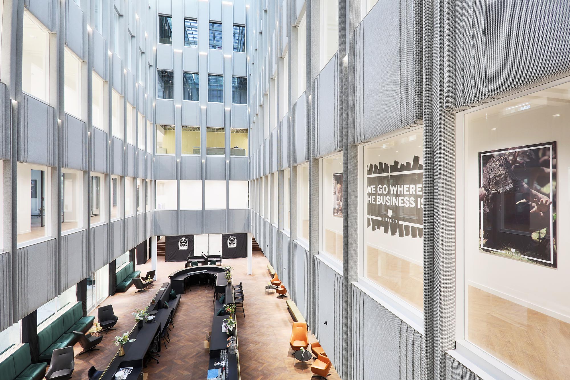 Naast de uitstekende geluidsisolerende eigenschappen van de glas- en tussenwanden van Intermontage, is ook het Atrium een genot voor het oor. Het Atrium bewijst dat door toepassing van de juiste materialen ook in een lastige smalle hoge open ruimte een goede akoestiek is te realiseren. Zo kunnen Tribes leden prettig netwerken in de grote bar midden in het gebouw.